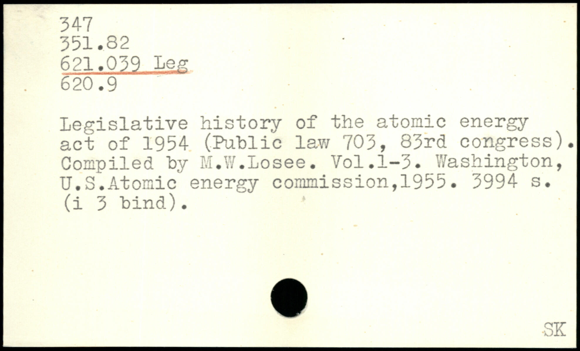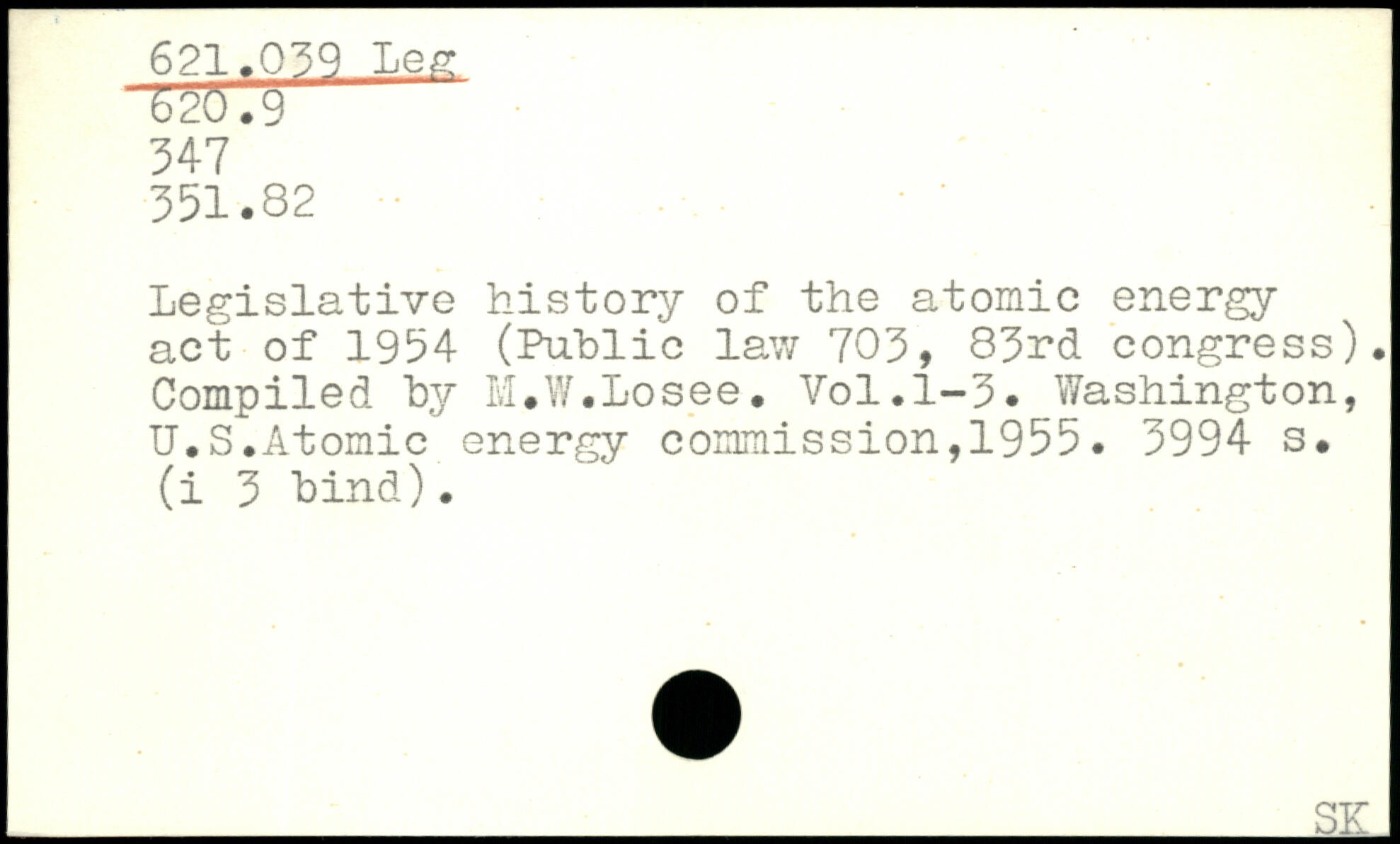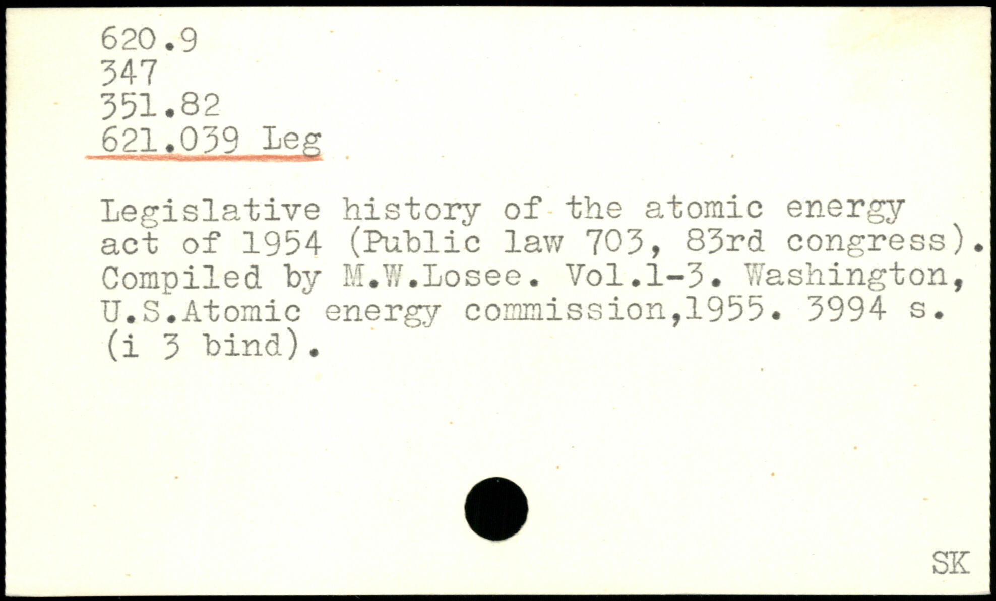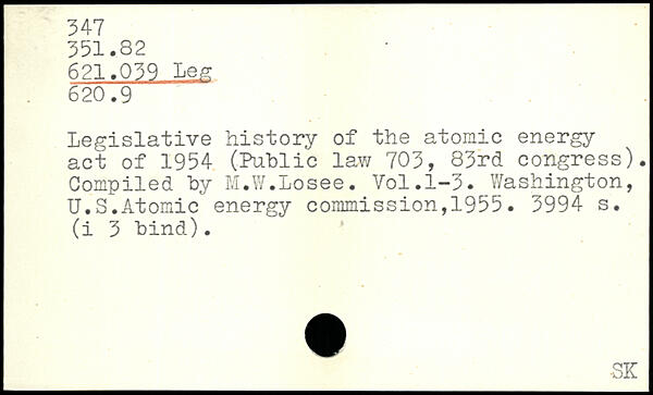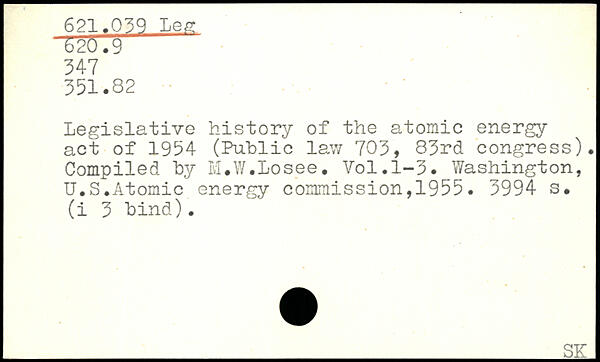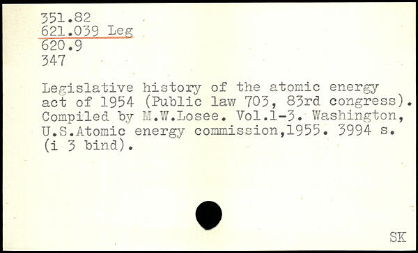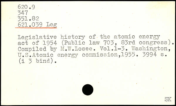 Legislative history of the atomic energy act of 1954 (Public law 703, 83rd congress). Compiled by M.W.Losee.
