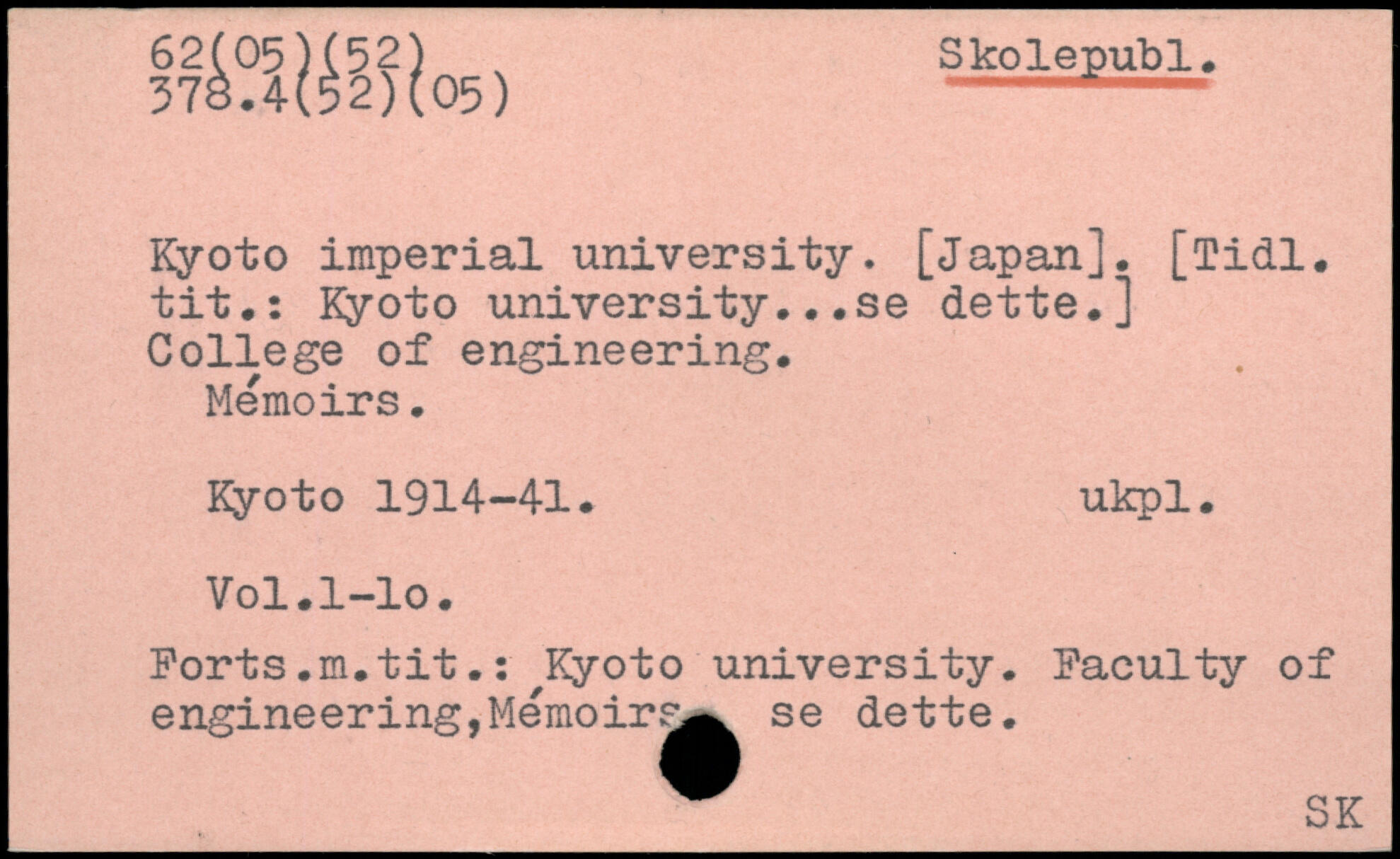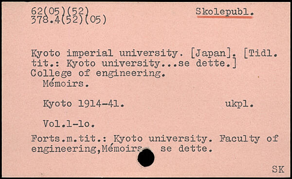 Kyoto imperial university. [Japan], [Tidl. tit,: Kyoto university,.,se dette.] College of engineering. Memoirs. Kyoto 1914-41, ukpl. Vol.l-lo. Ports,m.tit,: Kyoto university. Faculty of engineering,Memoir^^ se dette.
