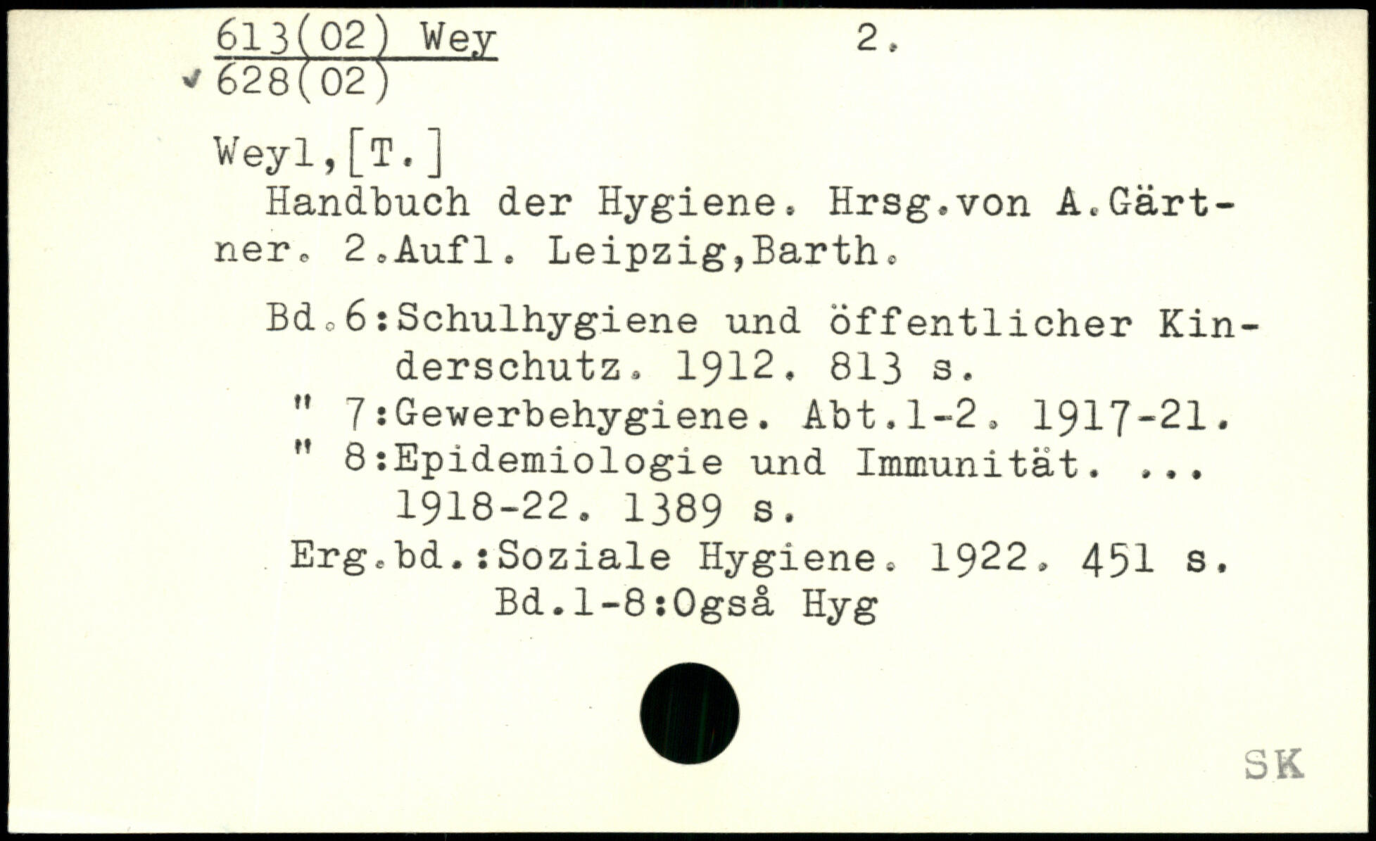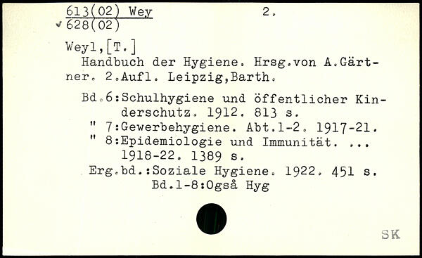 Handbuch der Hygiene, Hrsg,von A,Gärtner, 2,Aufl. Leipzig,Barths Bd,6:Schulhygiene und öffentlicher Kinderschutz, 1912. 813 3. ” 7:Gewerbehygiene. Abt.1-2, 1917"21. .. 8 :Epidemiologie und Immunität. ... 1918-22.