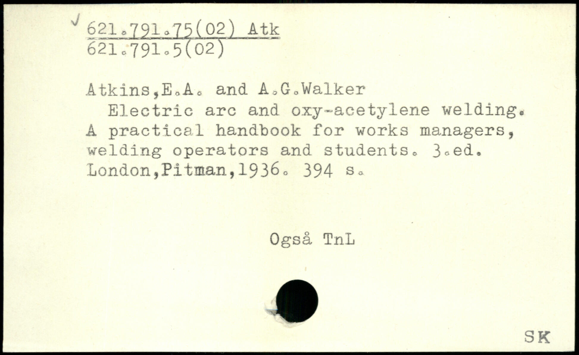 Atkins,EoAo and. A,G,Walker Electric arc and oxy~acetylene welding. A practical handbook for works managers, welding operators and students