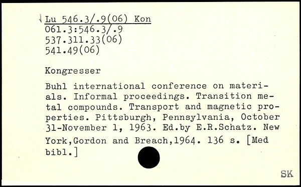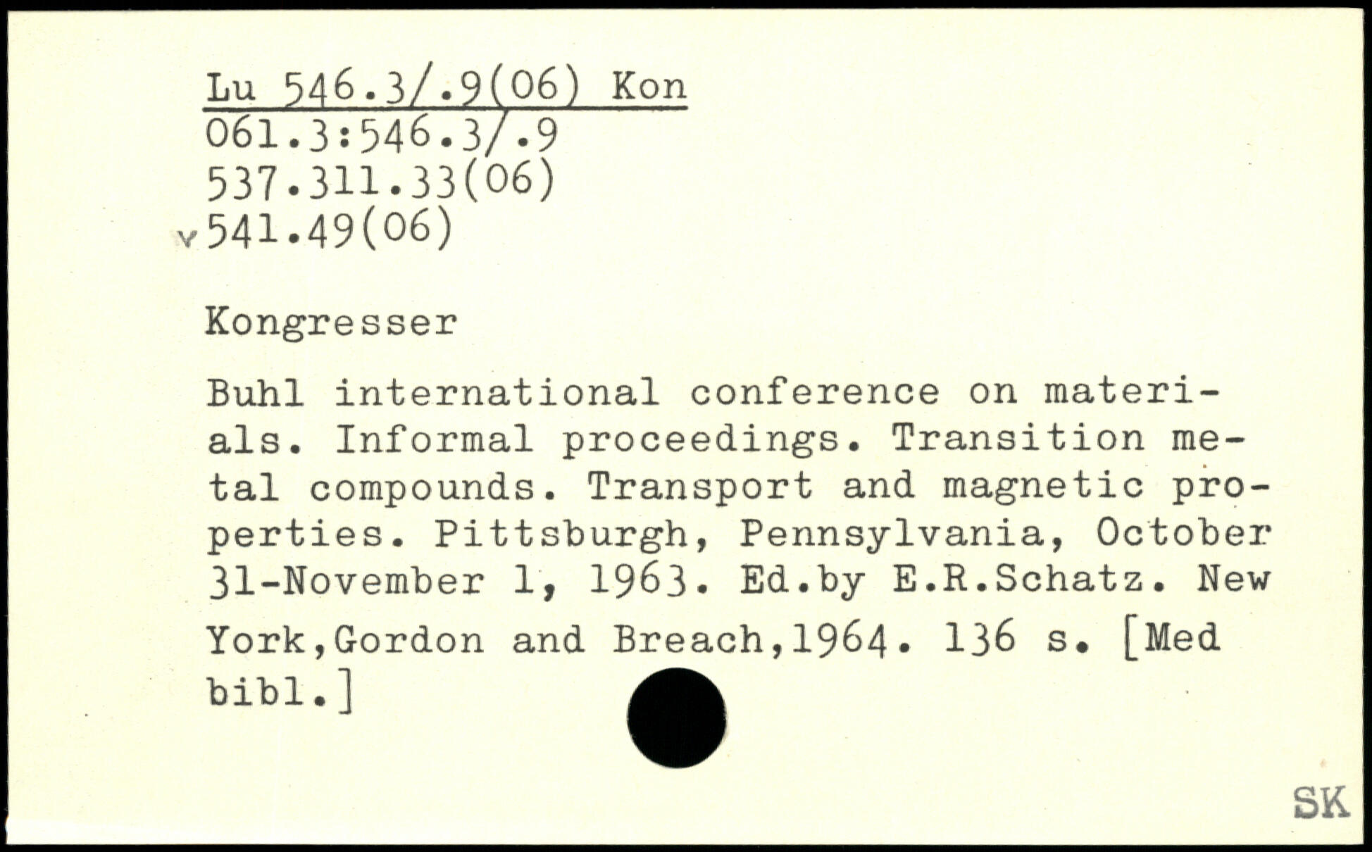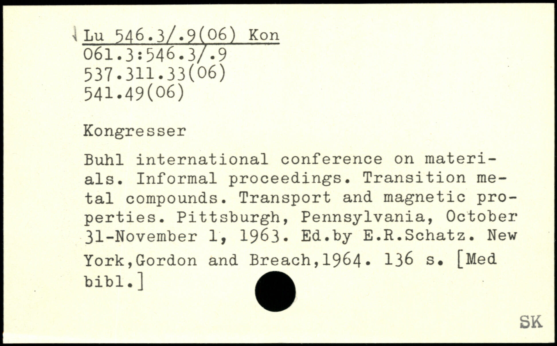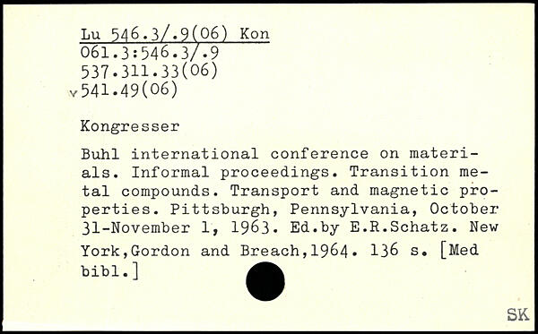 Buhl international conference on materials. Informal proceedings. Transition metal compounds. Transport and magnetic properties. Pittsburgh, Pennsylvania, October 31-November 1, 1963. Ed.by E.R.Schatz.