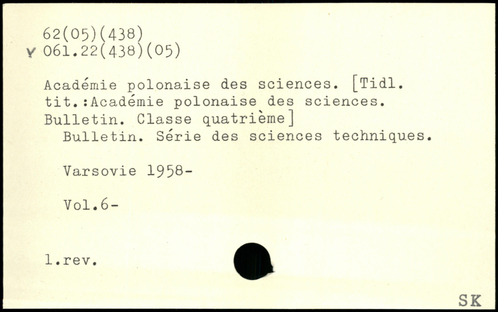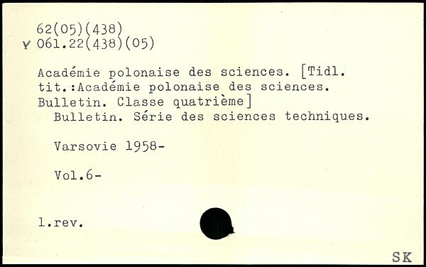 Académie polonaise des sciences. [Tidl. tit.îAcadémie polonaise des sciences. Bulletin. Classe quatrième] Bulletin. Série des sciences techniques. Varsovie 1958-