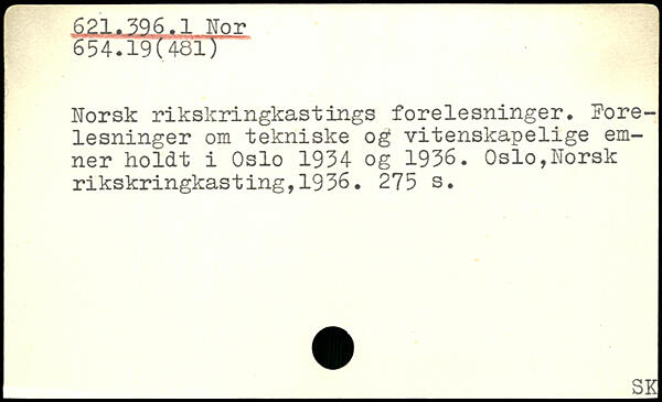 Norsk rikskringkastings forelesninger. Pore-lesninger om tekniske og vitenskapelige emner holdt i Oslo 1934 og 1936.