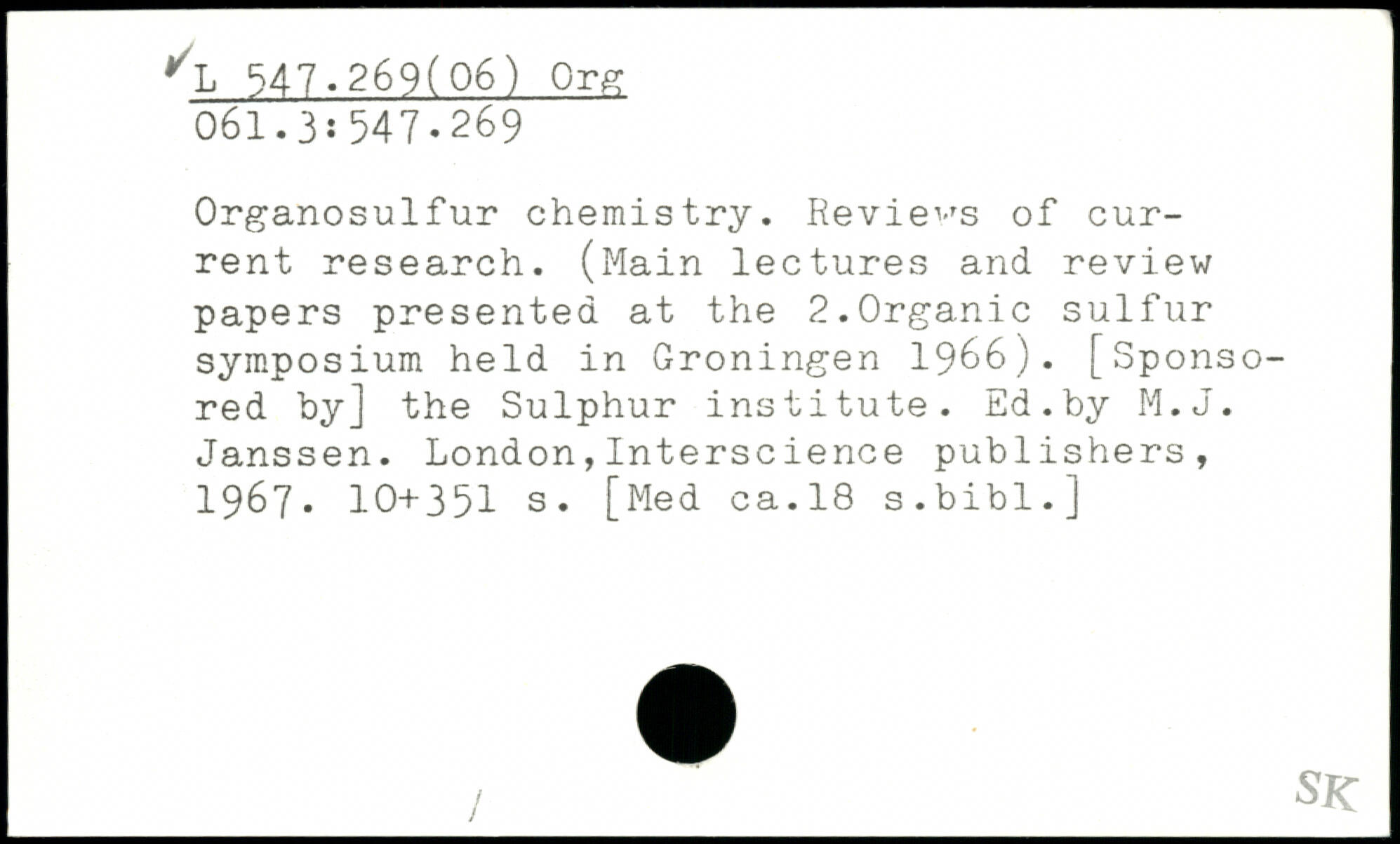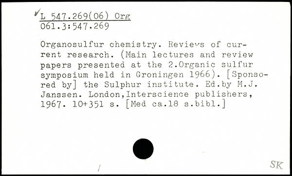 Organosulfur chemistry. Reviews of current research. (Main lectures and review papers presented at the 2.Organic sulfur symposium held in Groningen 1966). [Sponsored by] the Sulphur institute. Ed.by M.J. Janssen.