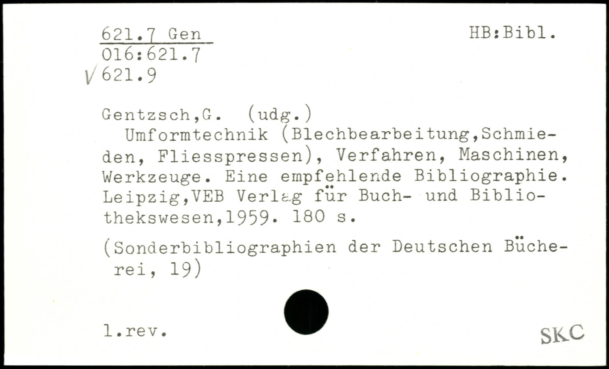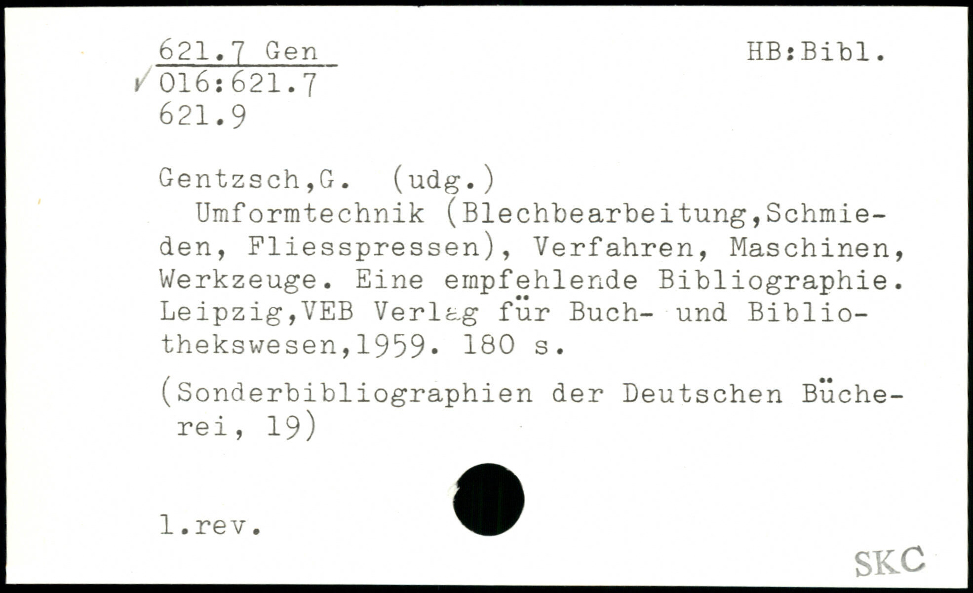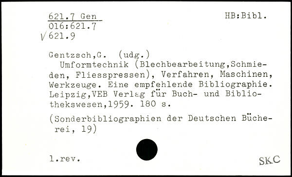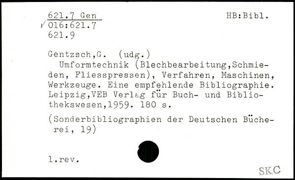 Umformtechnik (Blechbearbeitung,Schmieden, Fliesspressen), Verfahren, Maschinen, Werkzeuge. Eine empfehlende Bibliographie. Leipzig,VEB Verlag für Buch- und Bibliothekswesen ,1959.