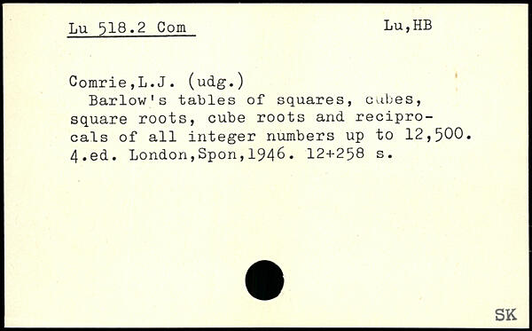 Barlow's tables of squares, cubes, square roots, cube roots and reciprocals of all integer numbers up to 12,500.