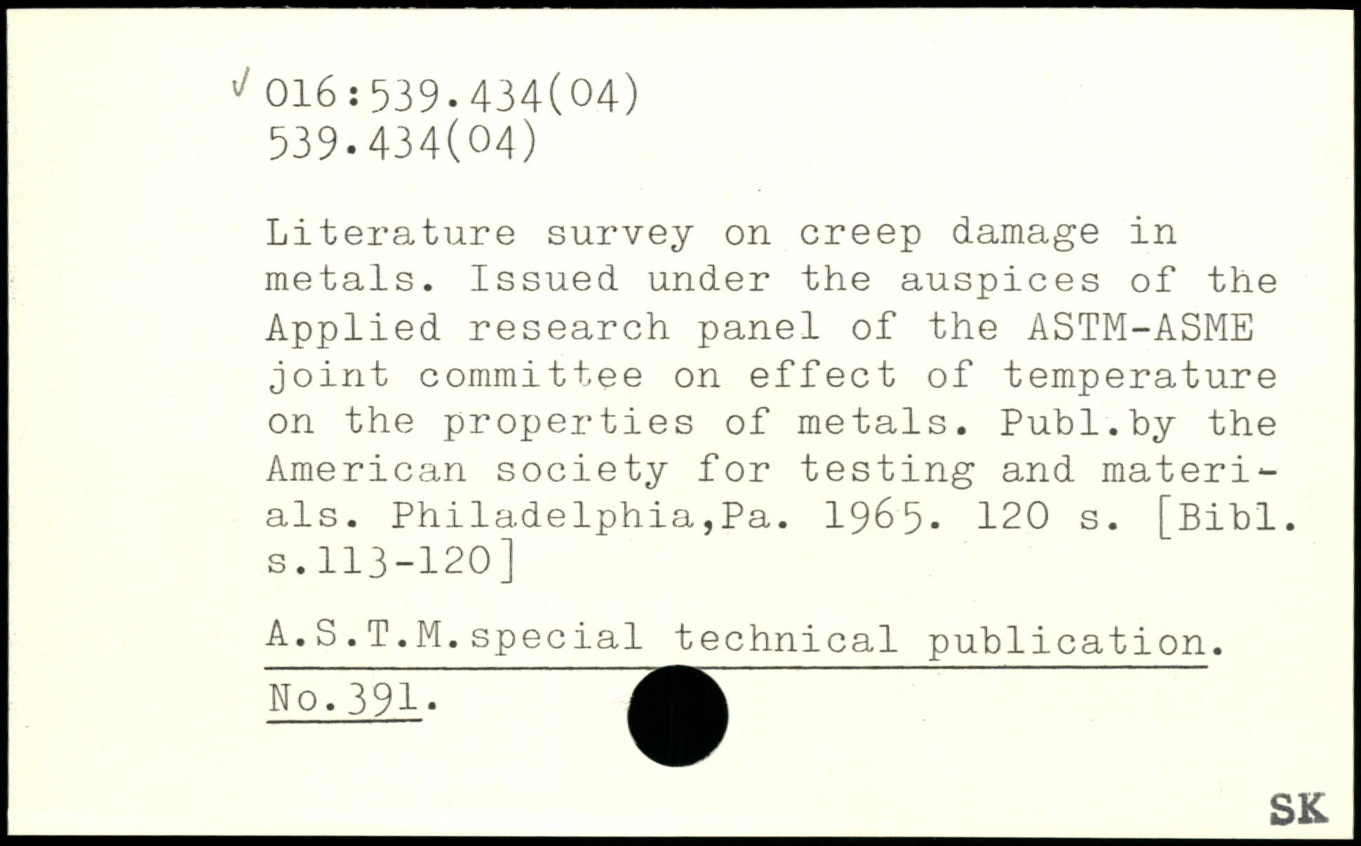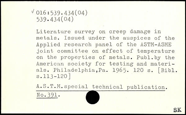 Literature survey on creep damage in metals. Issued under the auspices of the Applied research panel of the ASTM-ASME joint committee on effect of temperature on the properties of metals.