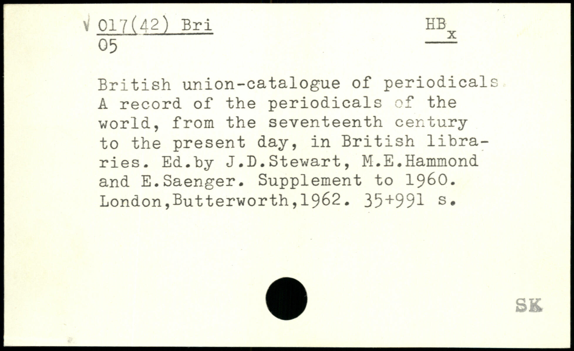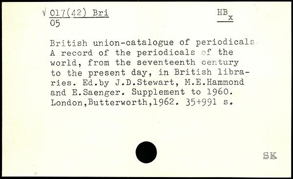 British union-catalogue of periodicals A record of the periodicals of the world, from the seventeenth century to the present day, in British libraries. Ed.by J.D.Stewart, M.E.Hammond and E.Saenger. Supplement to 1960.