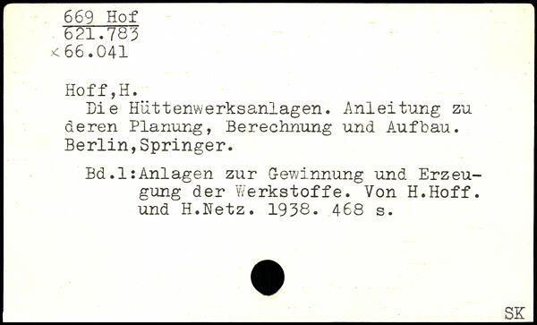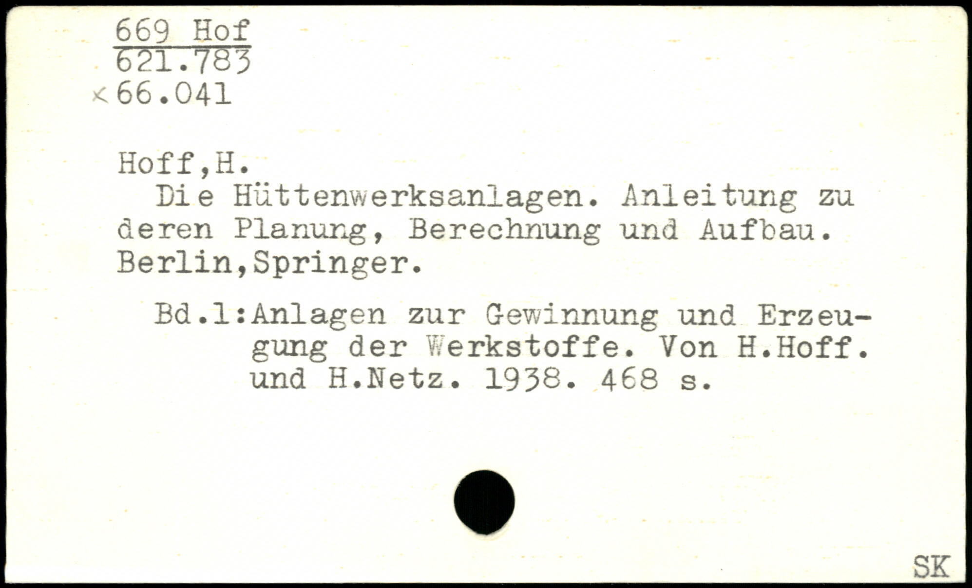 Die Hüttenwerksanlagen. Anleitung zu deren Planung, Berechnung und Aufbau. Berlin,Springer. Bd.l:Anlagen zur Gewinnung und Erzeugung der Werkstoffe. Von H.Hoff. und H.Netz. 1938.
