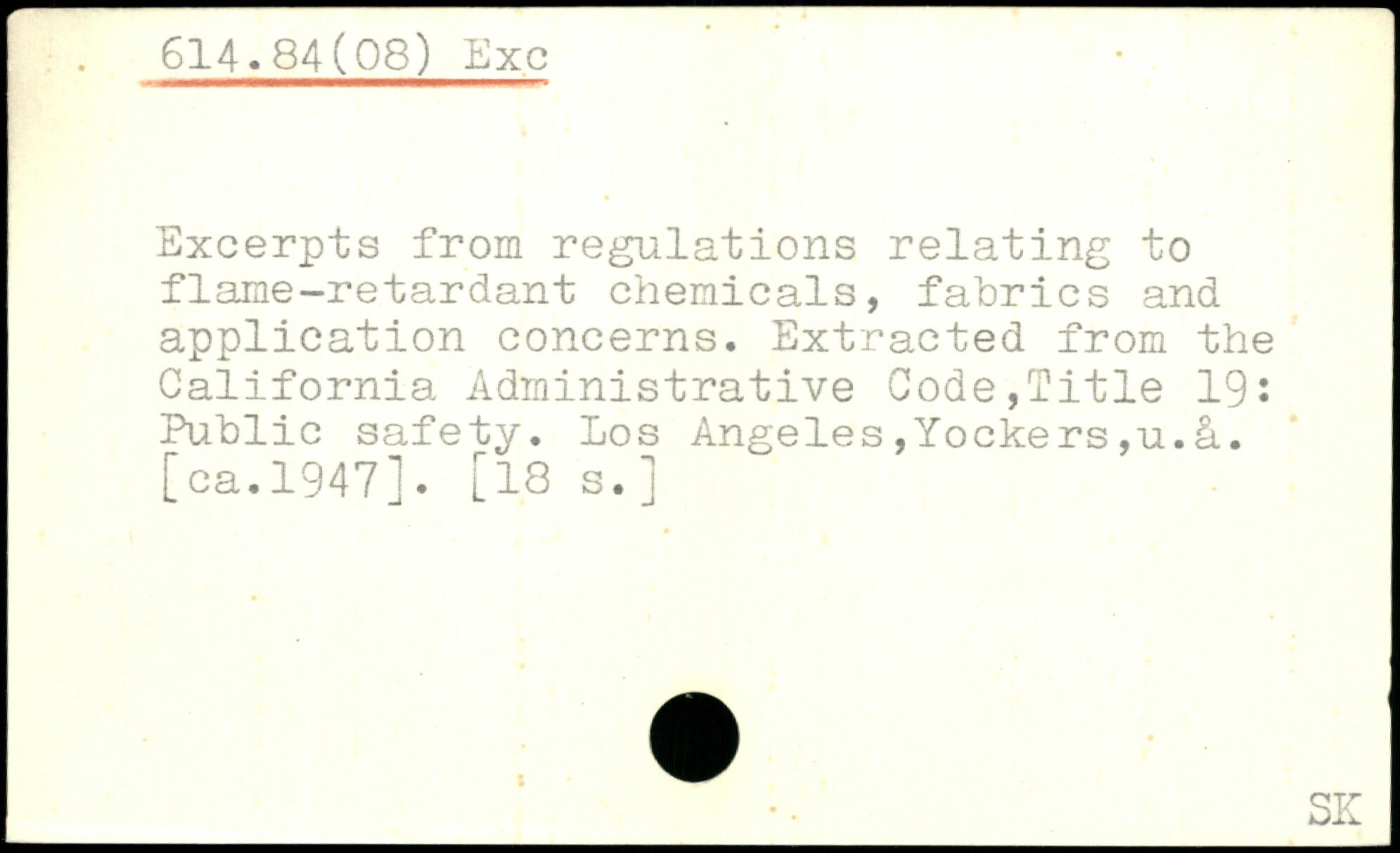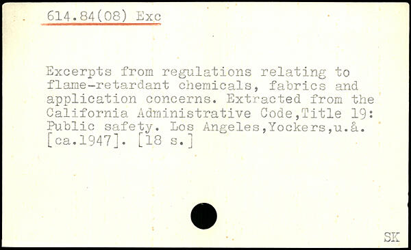 Excerpts from regulations relating to flame-retardant chemicals, fabrics and application concerns. Extracted from the California Administrative Code,Title 19: Public safety. Los Angeles,Yockers,u.â.