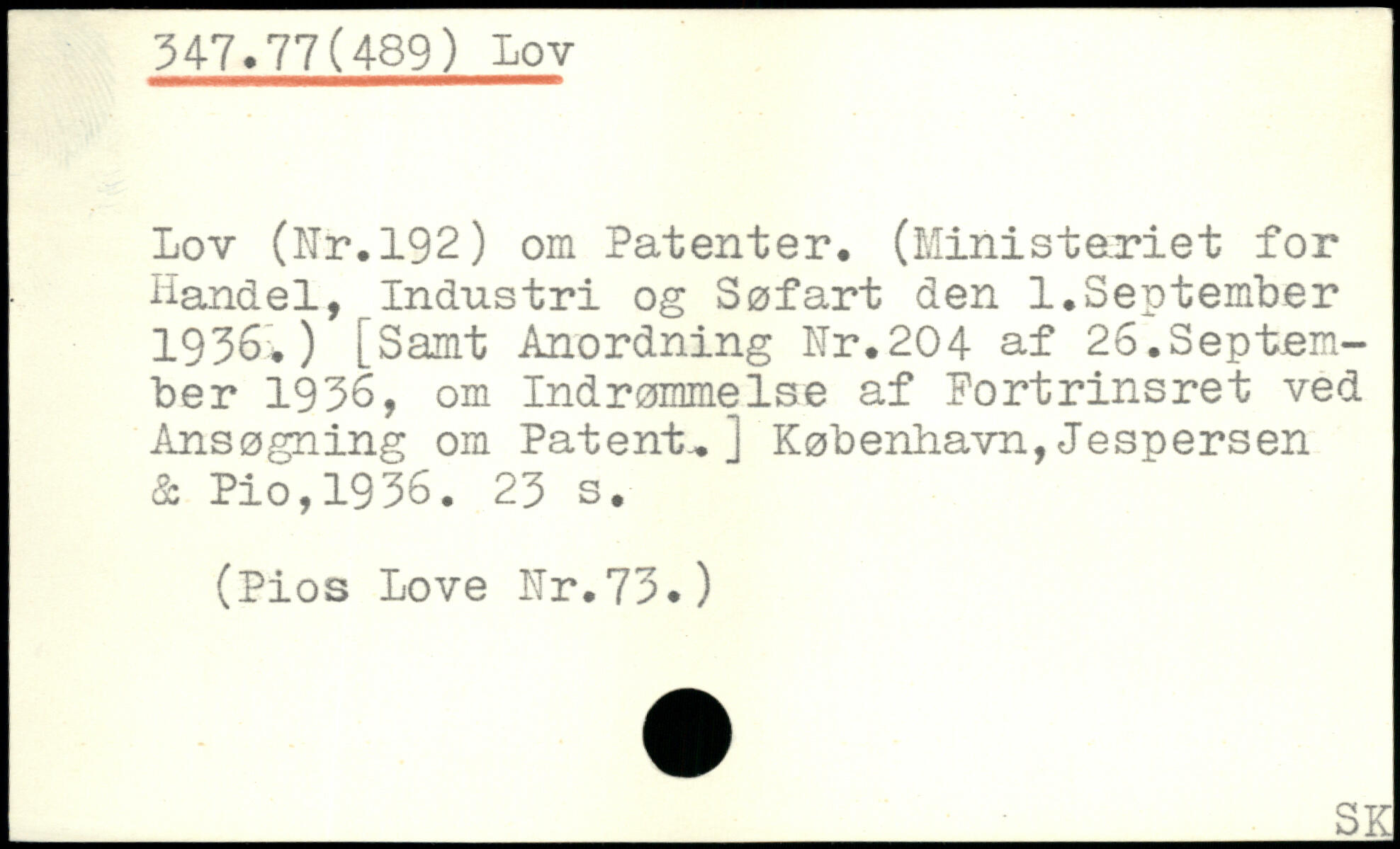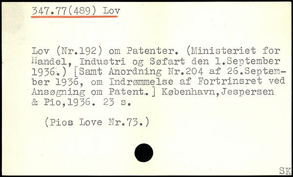 Lov (Nr.192) om Patenter. (Ministeriet for Handel, Industri og Søfart den 1.September 1936.) [Samt Anordning Nr.204 af 26.September 1936, om Indrømmelse af Fortrinsret ved Ansøgning om Patent..]