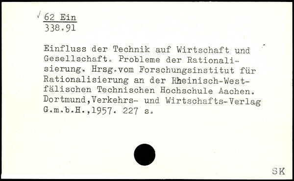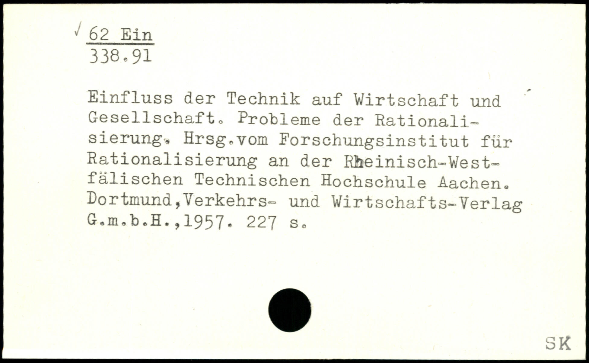 Einfluss der Technik auf Wirtschaft und Gesellschafto Probleme der Rationalisierung. Hrsg.vom Forschungsinstitut für Rationalisierung an der Rheinisch-West-fälisehen Technischen Hochschule Aachen. Hörtmund,Verkehrs-= und Wirtschafts-Verlag G.m.b.H.,1957.