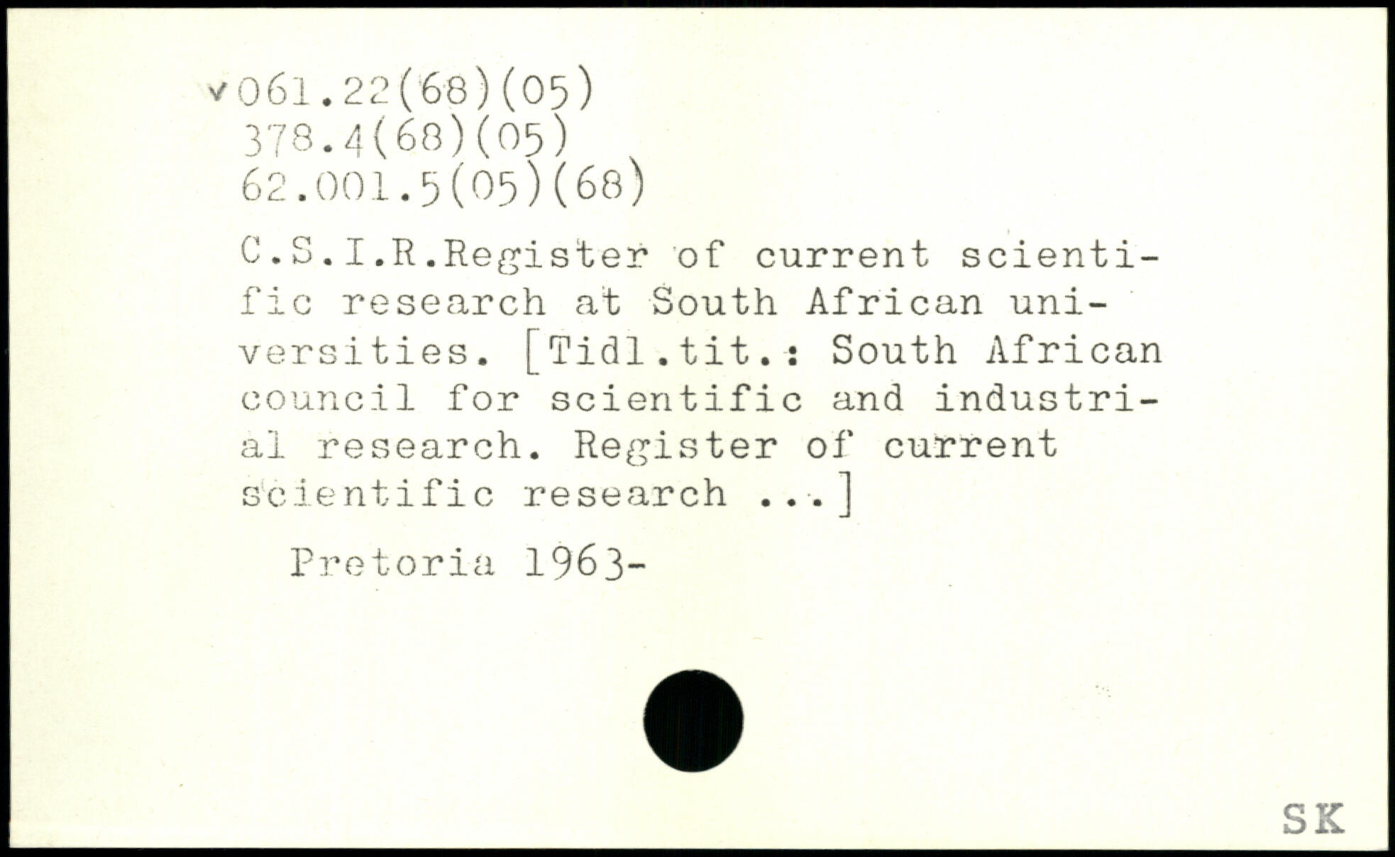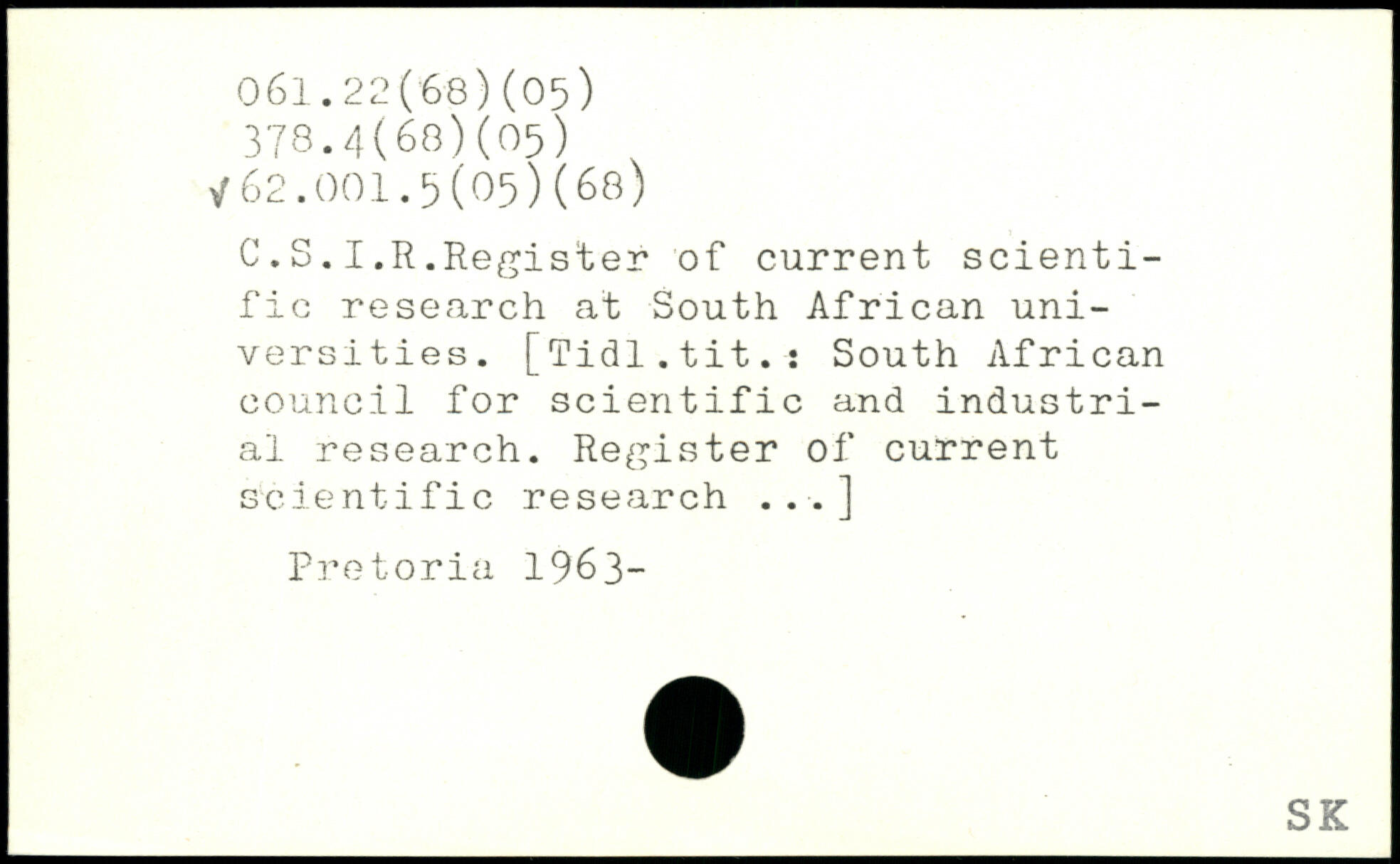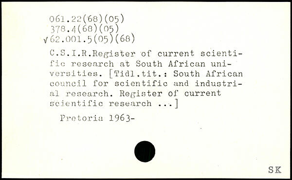 C.S.I.R.Register of current scientific research at South African universities. [Tidl.tit.: South African council for scientific and industrial research. Register of current scientific research ...] Pretoria 1963-