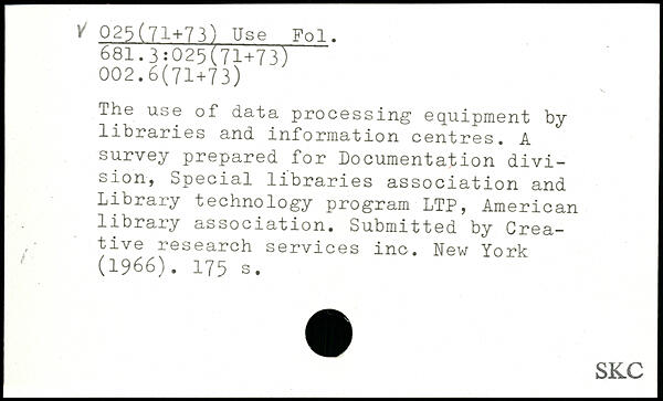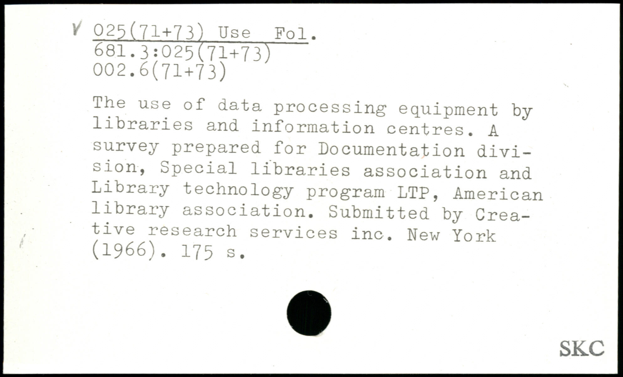 The use of data processing equipment by libraries and. information centres. A survey prepared for Documentation division, Special libraries association and Library technology program LTP, American association. Submitted by Crea— five research services inc. New York (1966).