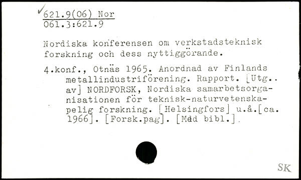 Nordiska konferensen om verkstadsteknisk forskning och dess nyttiggörande. 4.konf., Otnäs 1965- Anordnad av Finlands metallindustriförening. Rapport. [Utg.. av] NORDFORSK, Nordiska samarbetsorganisationen for teknisk-naturvetenska-pelig forskning, i Helsingfors] u.å.[ca. 1966].