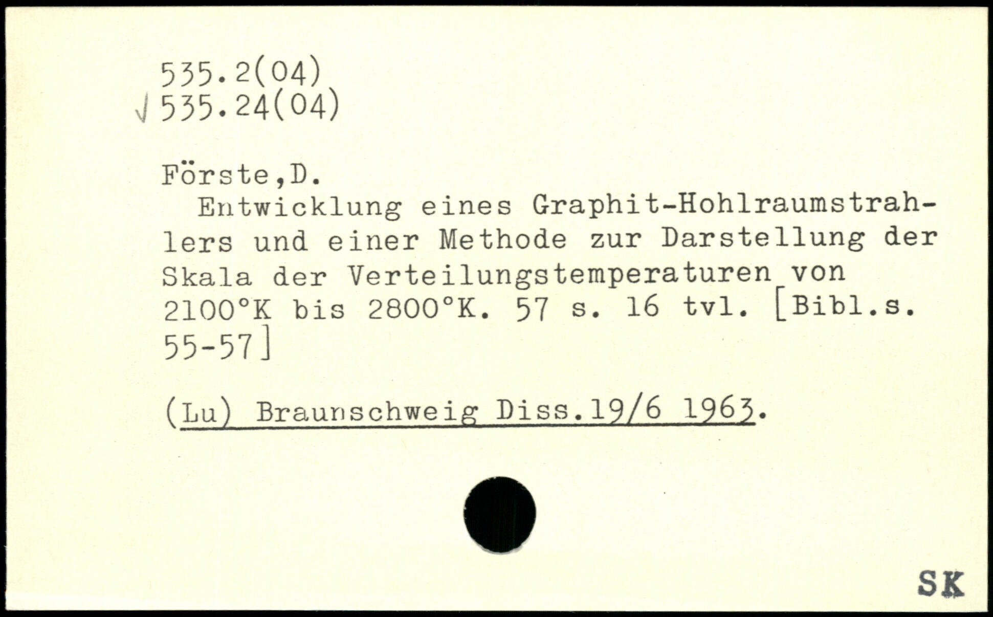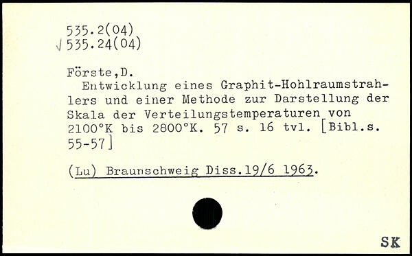 Entwicklung eines Graphit-Hohlraumstrah-lers und einer Methode zur Darstellung der Skala der Verteilungstemperaturen von 2100.K bis 2800.K.