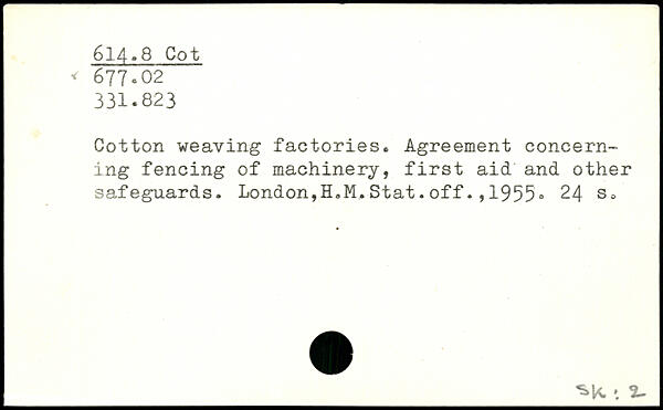 Cotton weaving factories. Agreement concerning fencing of machinery, first aid and other safeguards. London,H.M,Stat.off1955