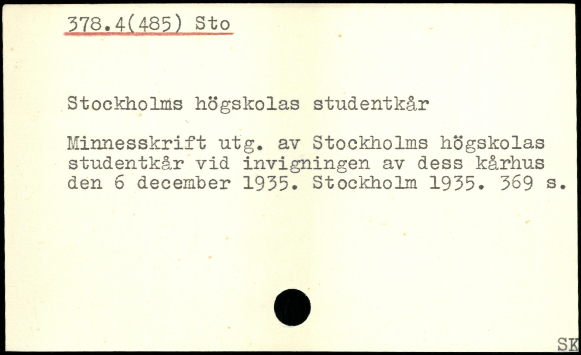 Stockholms högskolas studentkår Minnesskrift utg. av Stockholms högskolas studentkår vid invigningen av dess kårhus den 6 december 1935.
