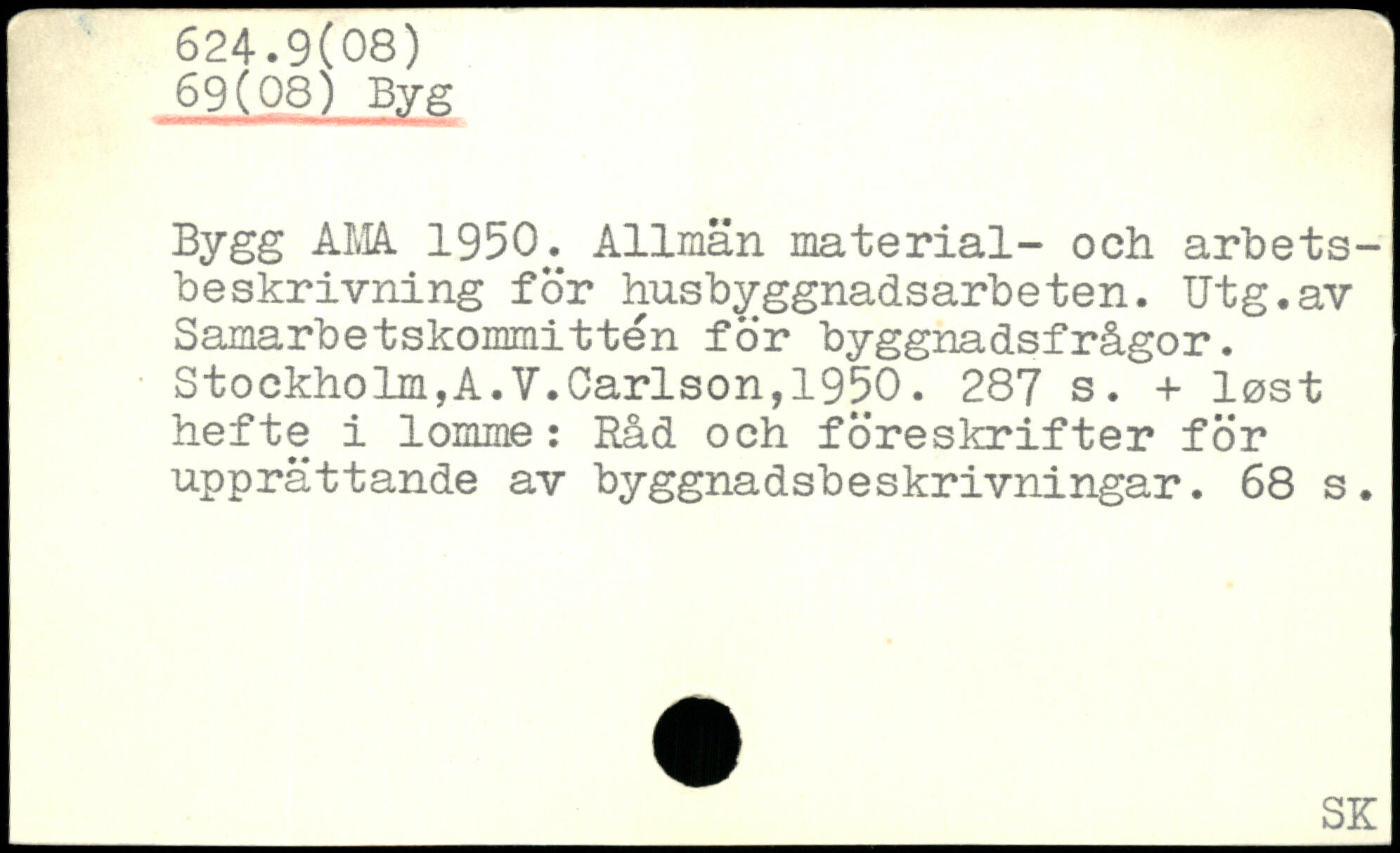Bygg AMA 1950. Allmän material- och arbetsbeskrivning för husbyggnadsarbeten. Utg.av Samarbetskommittén för byggnadsfrågor. Stockholm,A.V.Carlson,1950.