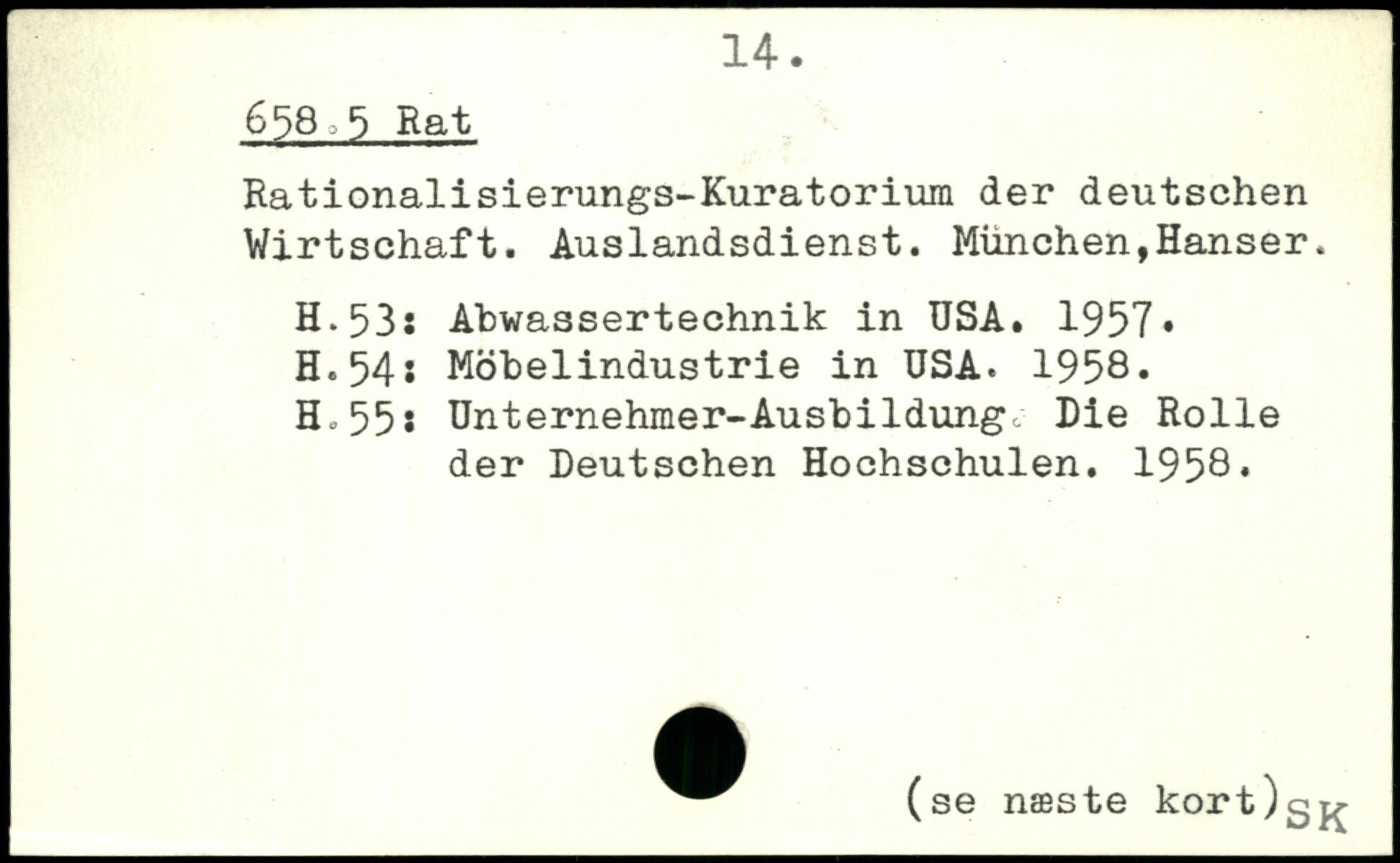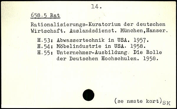 Rationalisierungs-Kuratorium der deutschen Wirtschaft. Auslandsdienst. München,Hanser. H.53: Abwassertechnik in USA. 1957, H.54s Möbelindustrie in USA. 1958. H,55. Unternehmer-Ausbildung; Die Rolle der Deutschen Hochschulen. 1958. (se næste kort)gj^