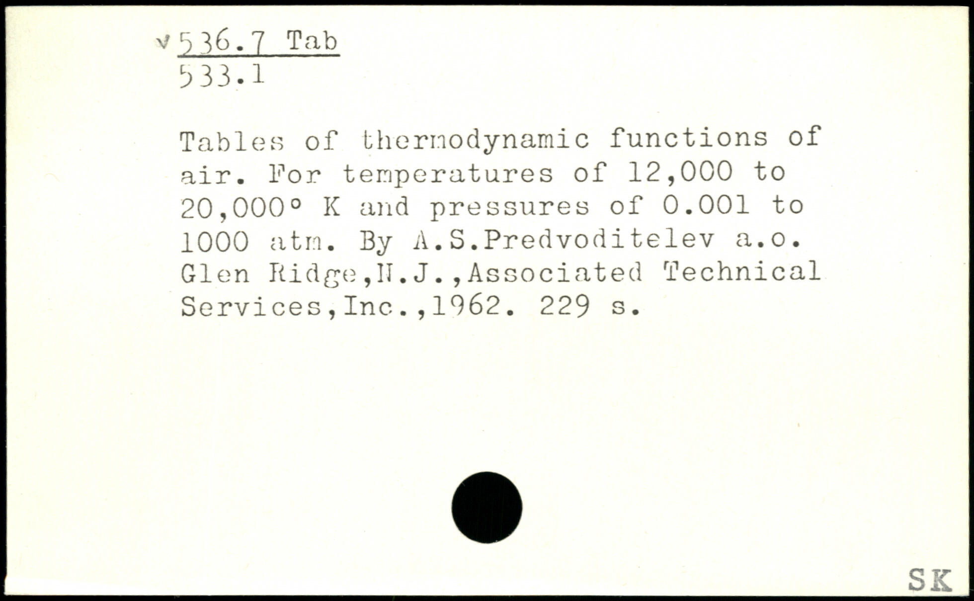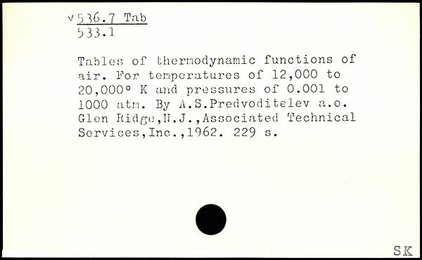 Tables of thernodynamic functions of air. lpor temperatures of 12,000 to 20,000. K and pressures of 0.001 to 1000 atm. By A.S.Predvoditelev a.o.