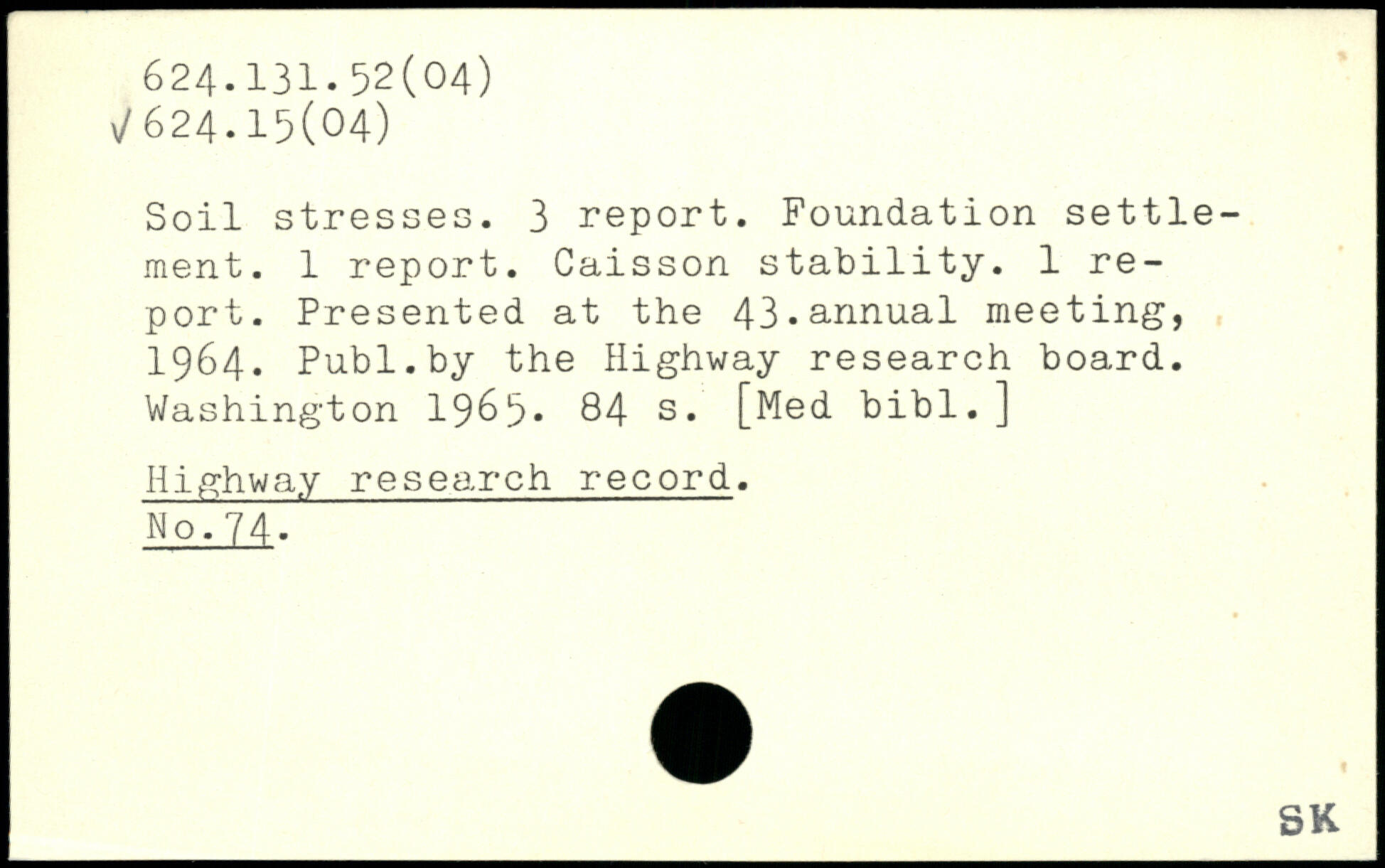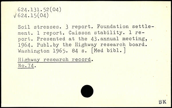Soil stresses. 3 report. Foundation settlement. 1 report. Caisson stability. 1 report. Presented at the 43.annual meeting, 1964.