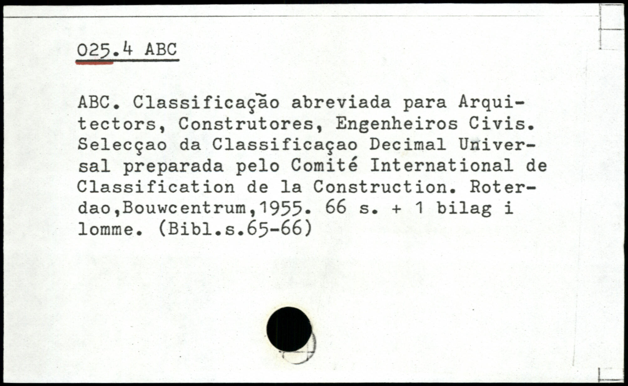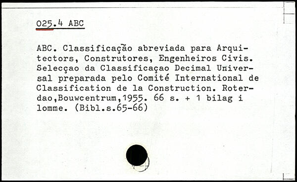 ABC, Classificagao abreviada para Arqui-tectors, Construtores, Engenheiros Civis. Selecgao da Classificagao Decimal Universal preparada pelo Comité International de Classification de la Construction.