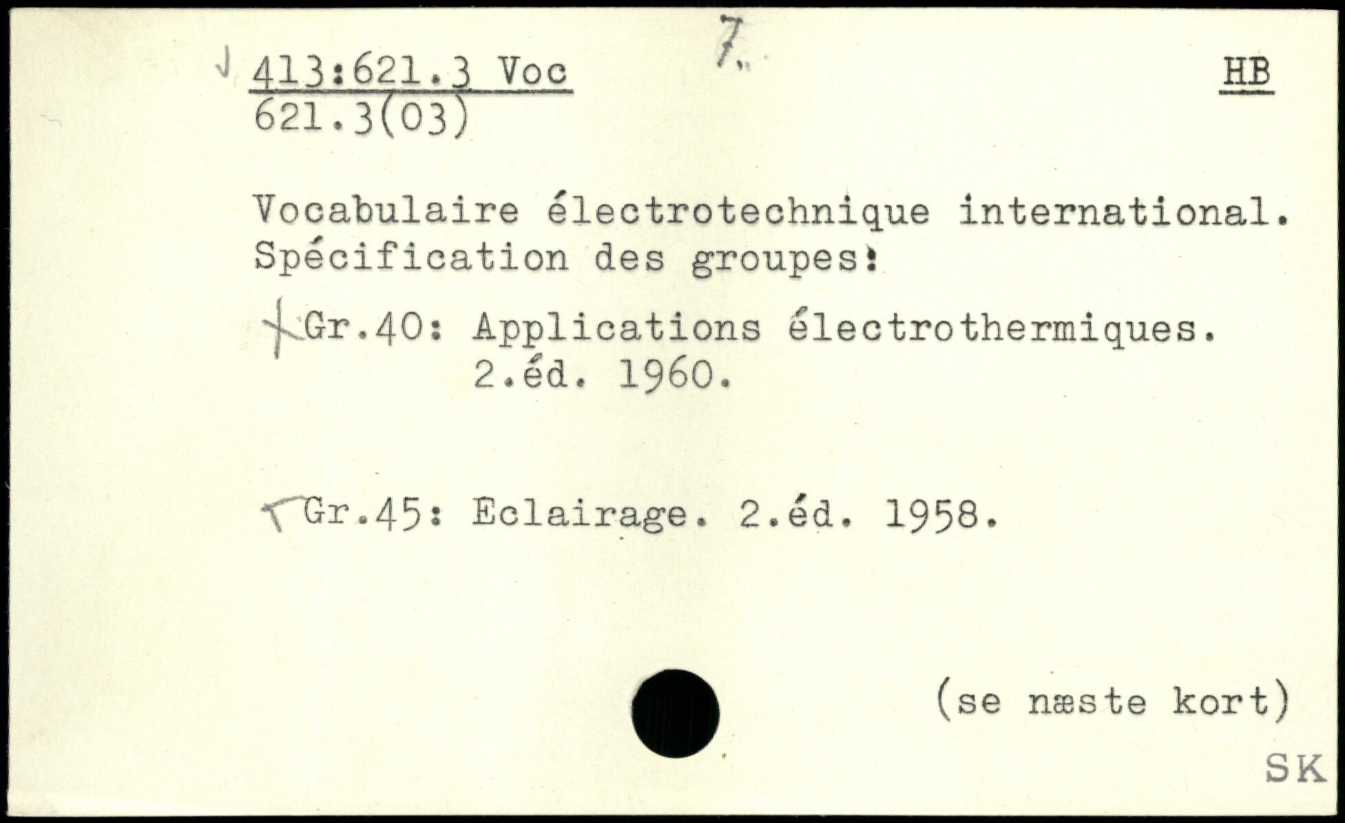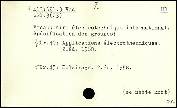 Vocabulaire électrotechnique international. Spécification des groupes! .jv.Gr.40: Applications électrothermiques. 2.éd. 1960. XnGr.45: Eclairage. 2.éd. 1958, (se næste kort) SK