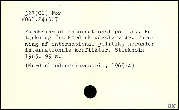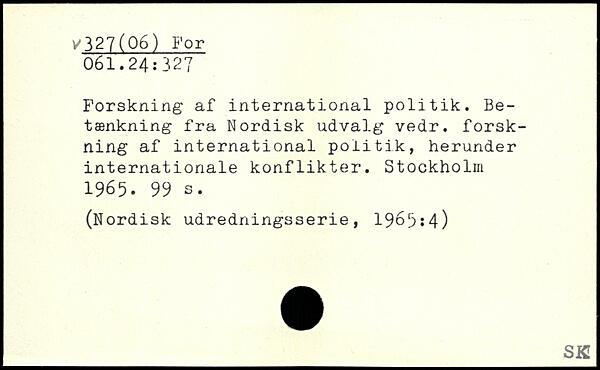 Forskning af international politik. Betænkning fra Nordisk udvalg vedr. forskning af international politik, herunder internationale konflikter.
