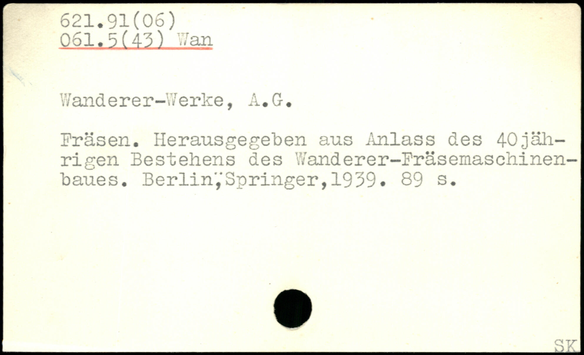 Wanderer-Werke, A.G. Fräsen. He raus ge.geben aus Anlass des ^jährigen Bestehens des Wanderer-Fräsemaschinen-baues. Berlin,'Springer,1939.