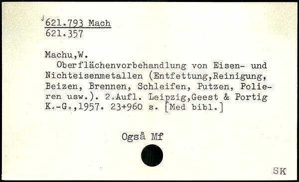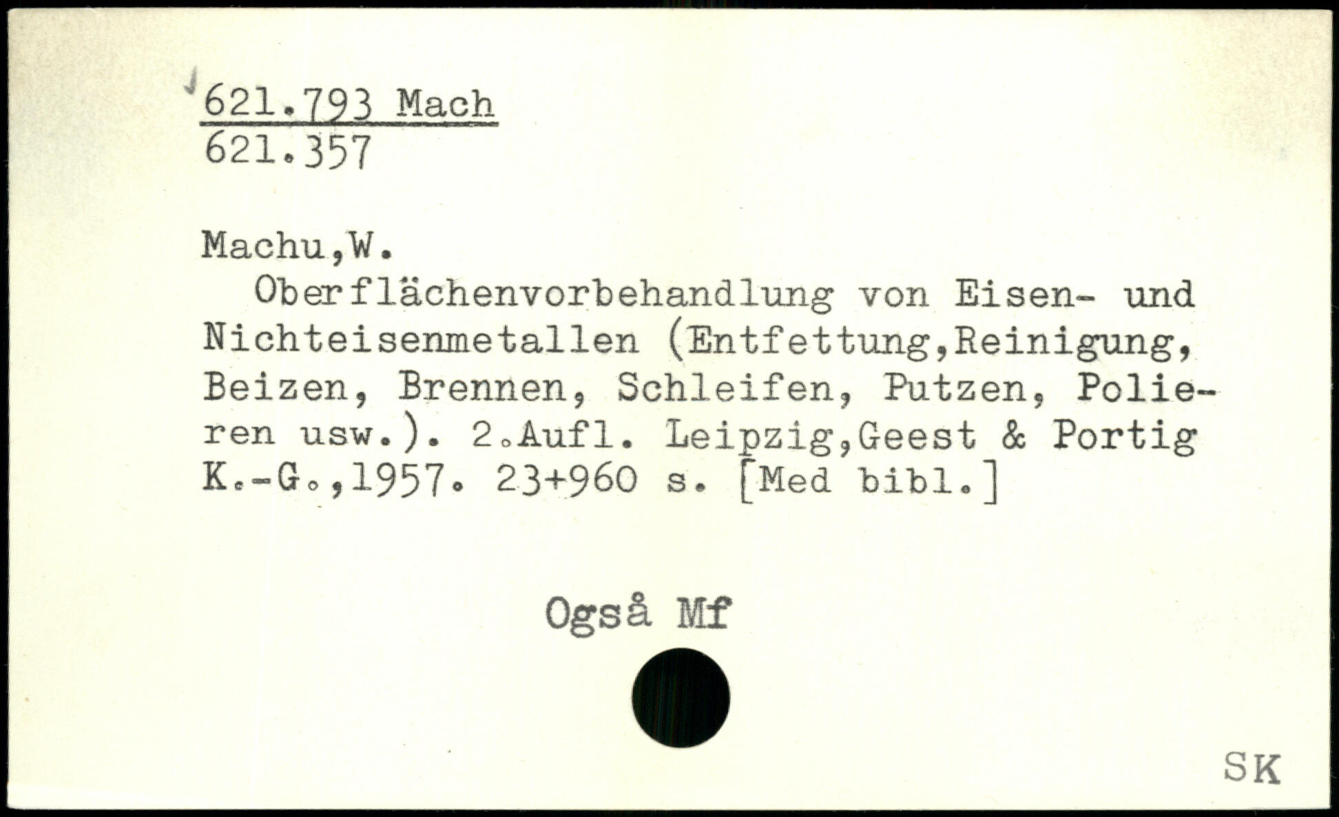 Oberflächenvorbehandlung von Eisen- und Nichteisenmetallen (Entfettung,Reinigung, Beizen, Brennen, Schleifen, Putzen, Polieren usw.). 2oAufl. Leipzig,Geest & Portig K.-Go,1957