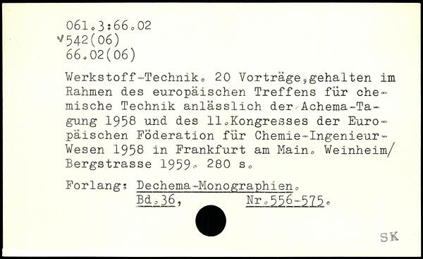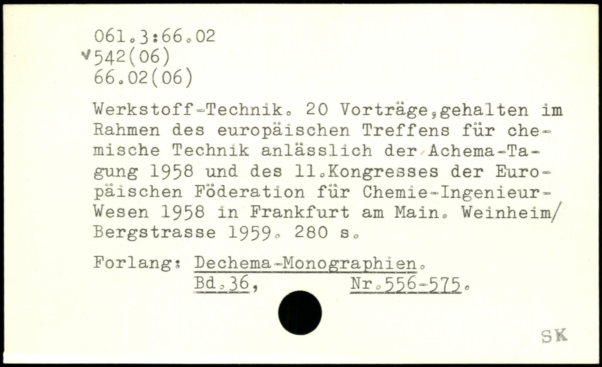 Werkstoff“Techniko 20 Vorträge,gehalten im Rahmen des europäischen Treffens für chemische Technik anlässlich der Achema-Ta-gung 1958 und des 11,Kongresses der Europäischen Föderation für Chemie-Ingenieur-Wesen 1958 in Frankfurt am Maina Weinheim/ Bergstrasse 1959^