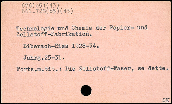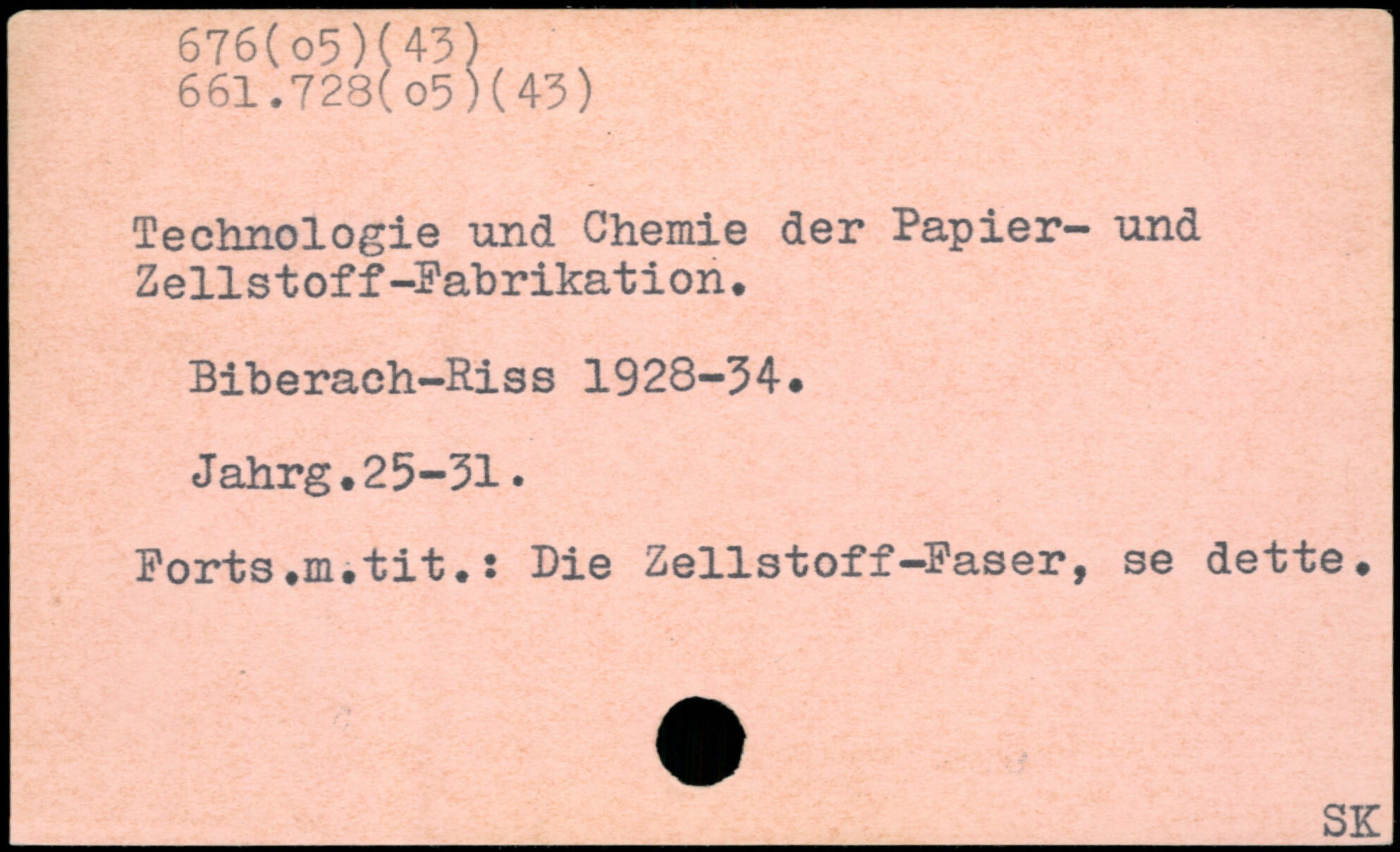 Technologie und Chemie der Papier- und Zellstoff-Pabrikation. Biberach-Riss 1928-34. Jahrg.25-31. Ports.m.tit.: Die Zellstoff-Paser, se dette. _SK