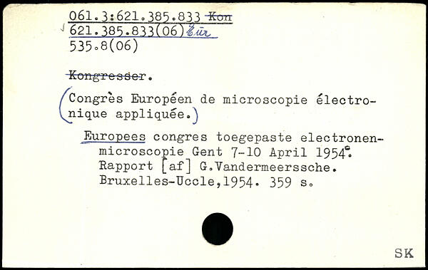 -Kongrcader. fCongrès Européen de microscopie électronique appliquée.) Europees congres toegepaste electronen-microscopie Gent 7-10 April 1954.. Rapport [af] G.Vandermeerssche. Bruxelles-Uccle,1954.
