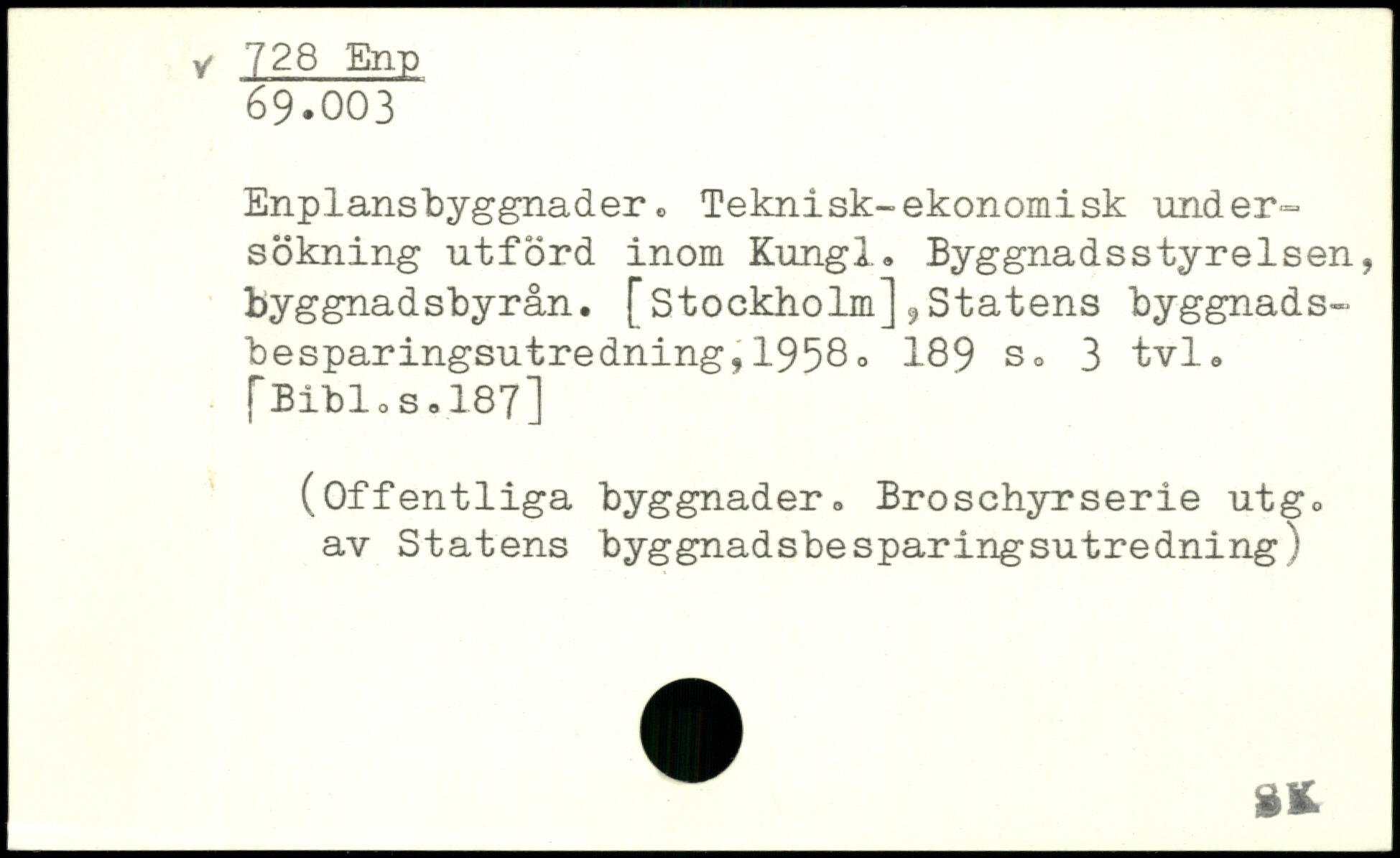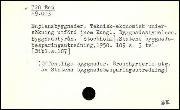 Enplansbyggnader <= Teknisk-ekonomi sk undersökning utförd inom Kungl, Byggnadsstyrelsen, byggnadsbyrån. [Stockholm],Statens byggnads- besparingsutredning,1958
