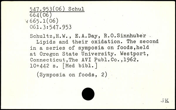Schultz,H.W., E.A.Day, R.0.Sinnhuber. Lipids and their oxidation. The second in a series of symposia on foods,held at Oregon State University. Westport, Connecticut,The AVI Publ.Co.,1962.
