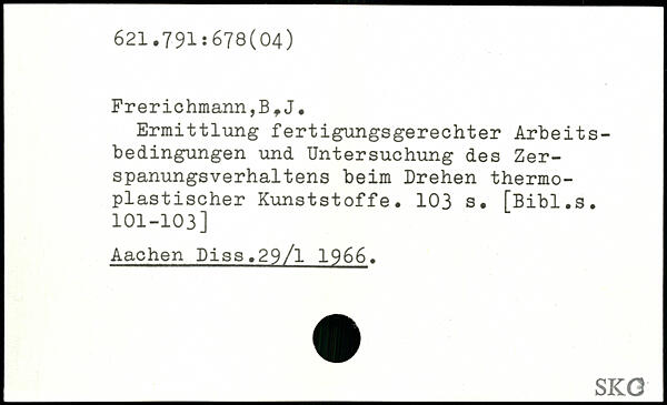 Frerichmann,BfJ. Ermittlung fertigungsgerechter Arbeitsbedingungen und Untersuchung des Zerspanungsverhaltens beim Drehen thermoplastischer Kunststoffe.