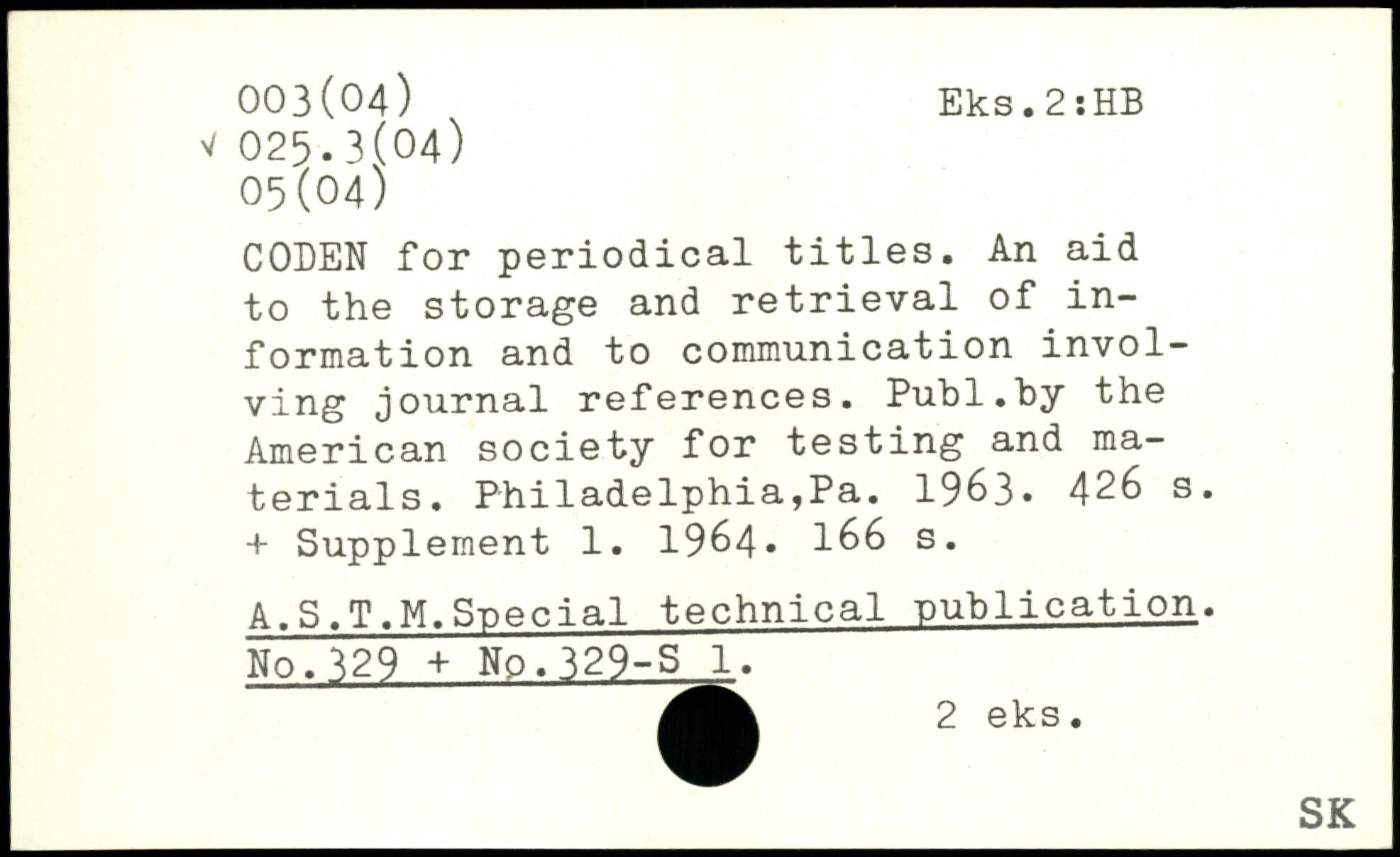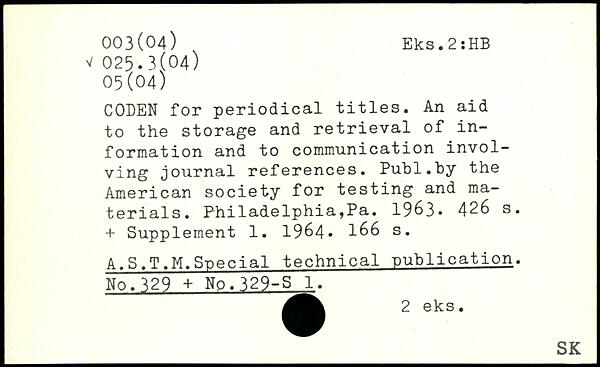 CODEN for periodical titles. An aid to the storage and retrieval of information and to communication involving journal references.