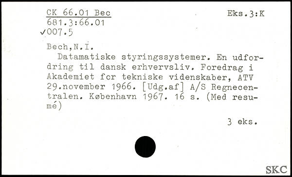 Datamatiske styringssysterner. En udfordring til dansk erhvervsliv. Foredrag i Akademiet fer tekniske videnskaber, ATV 29.november 1966.