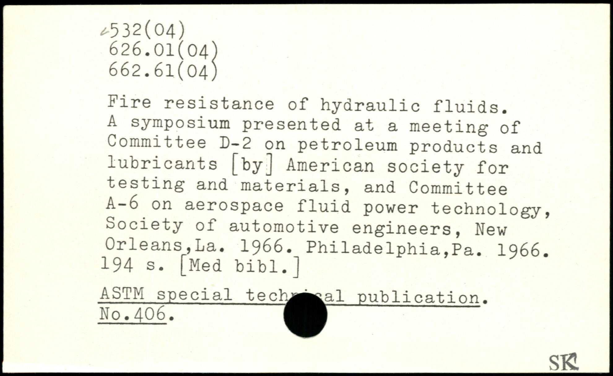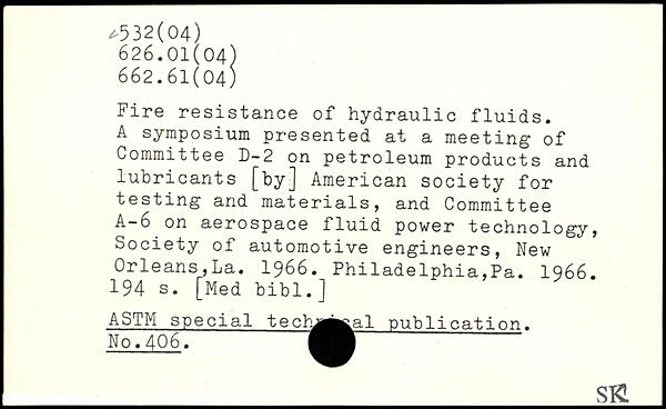 Fire resistance of hydraulic fluids. A symposium presented at a meeting of Committee D-2 on petroleum products and lubricants [by] American society for testing and materials, and Committee A—6 on aerospace fluid power technology, Society of automotive engineers, New Orleans,La. 1966. Philadelphia,Pa. 1966.