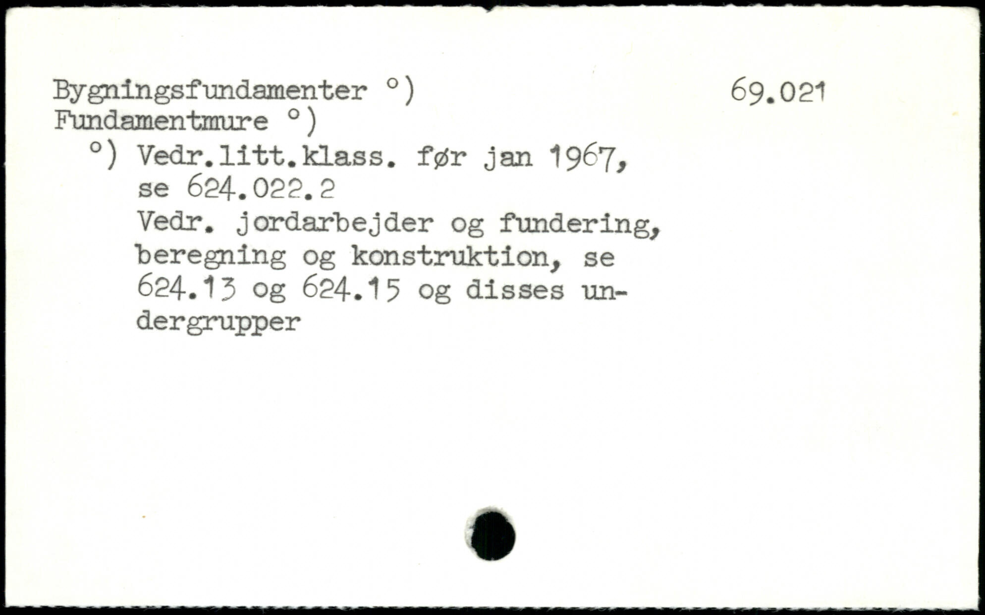 Bygningsf undamenter .) 69.021 Fundamentmure .) .) Vedr.litt.klass. før jan 1967, se 624.022.2 Vedr. jordarbejder og fundering, beregning og konstruktion, se 624.13 og 624.13 og disses undergrupper