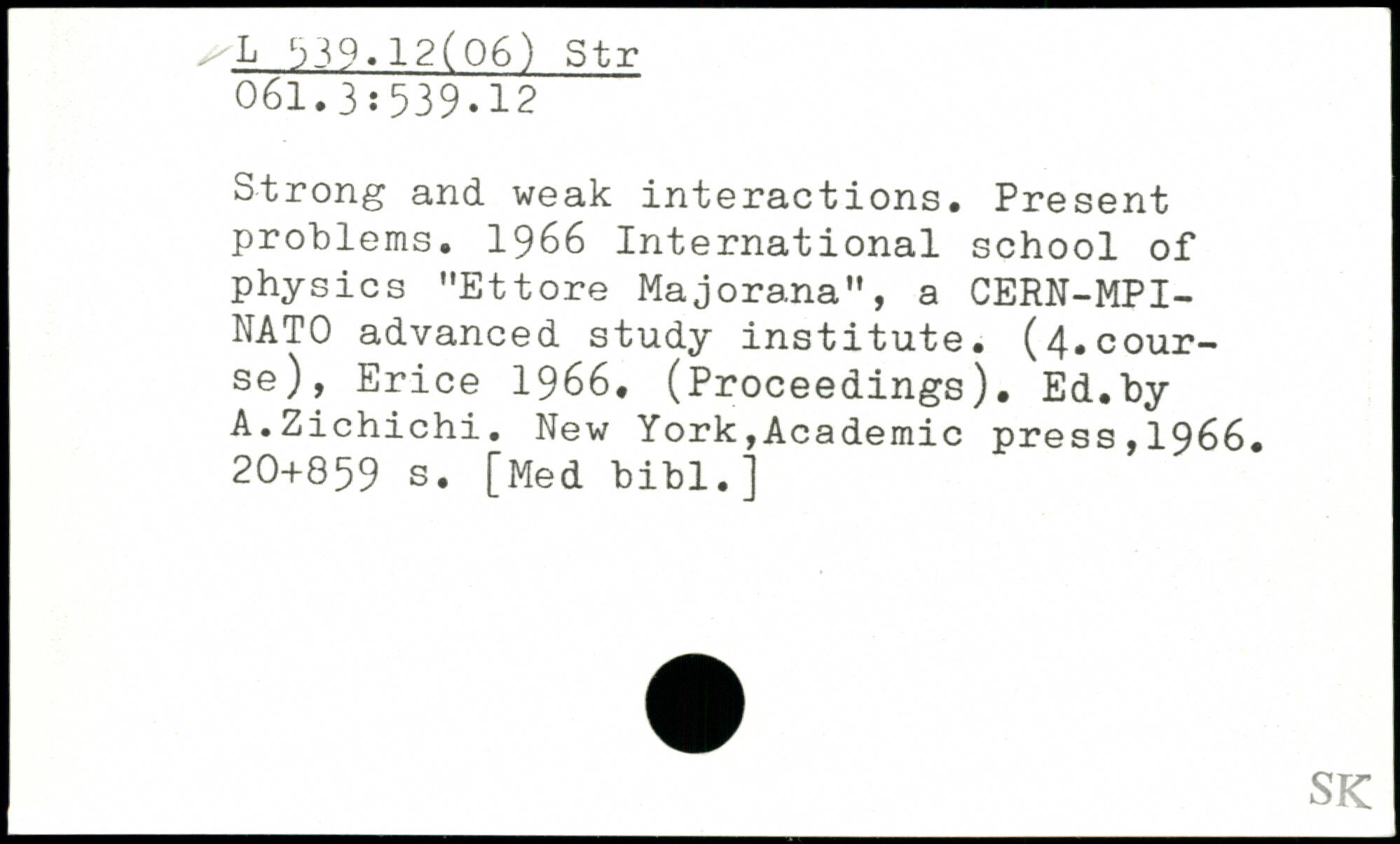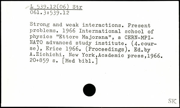 Strong and weak interactions. Present problems. 1966 International school of physics "Ettore Majorana", a CERN-MPI-NATO advanced study institute. (4.course), Erice 1966, (Proceedings), Ed.by A.Zichichi.