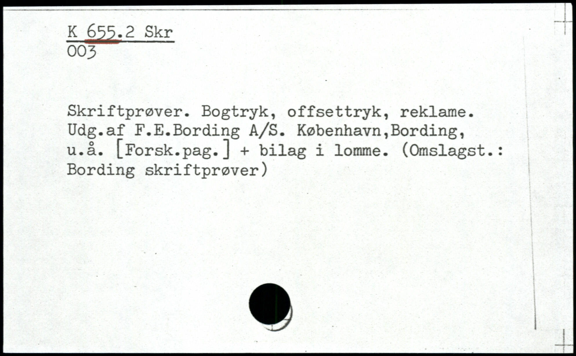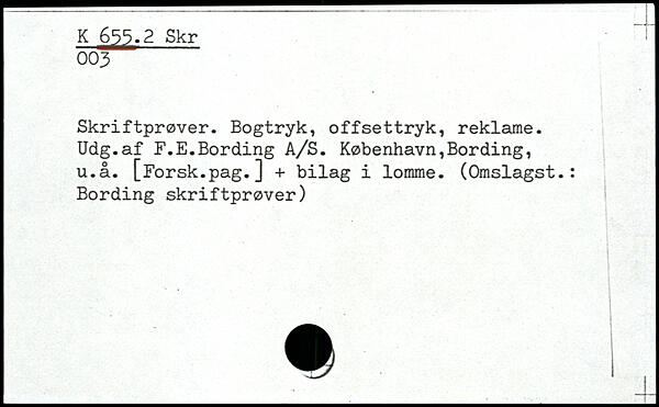 Skriftprøver. Bogtryk, offsettryk, reklame. Udg.af F.E.Bording A/S. København,Bording, u.å. [Forsk.pag.] + bilag i lomme. (Omslagst.: Bording skriftprøver)