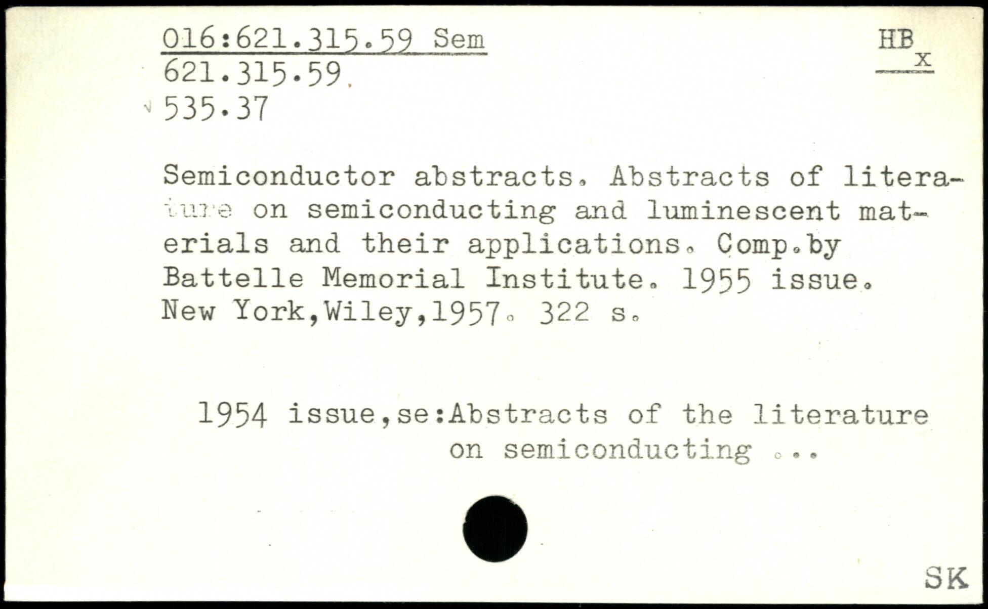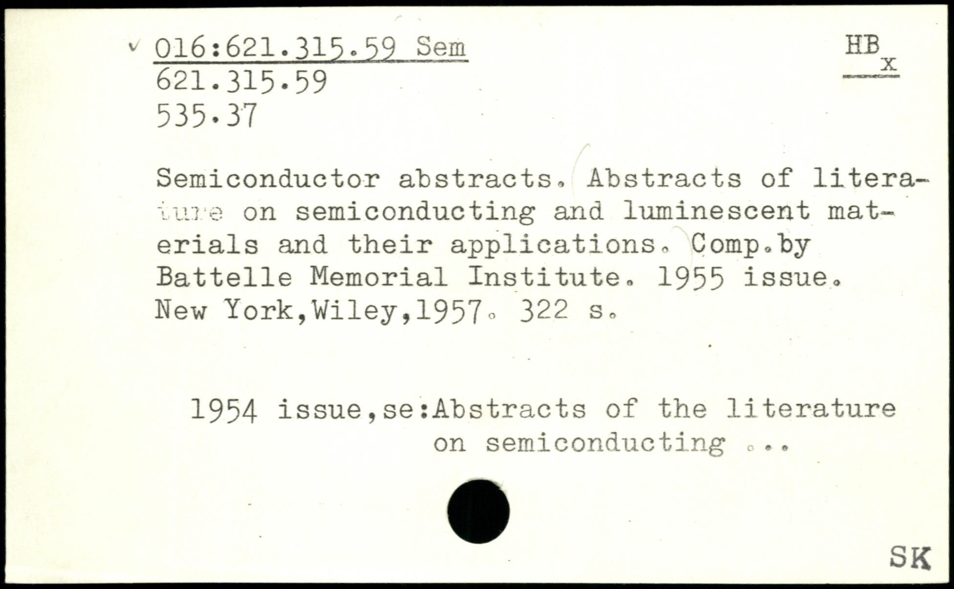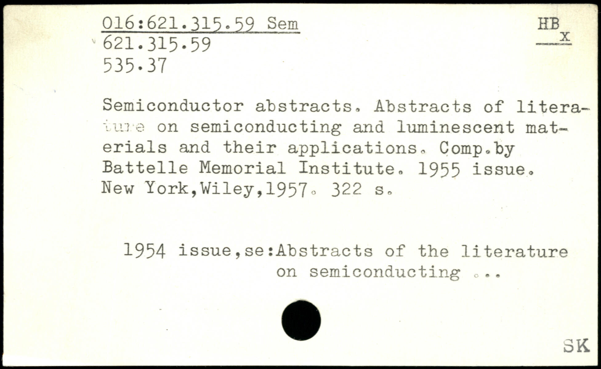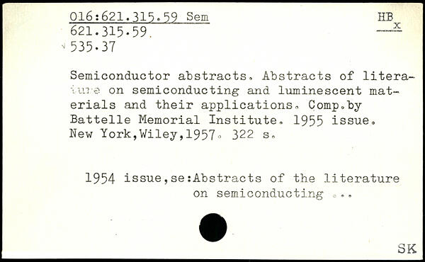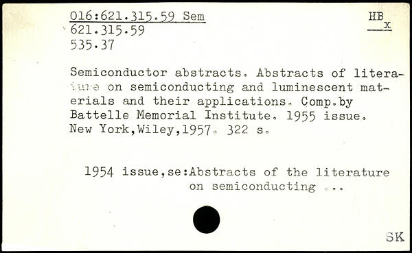 Semiconductor abstracts, Abstracts of literature on semiconducting and luminescent materials and their applications, Comp,by Battelle Memorial Institute, 1955 issue.
