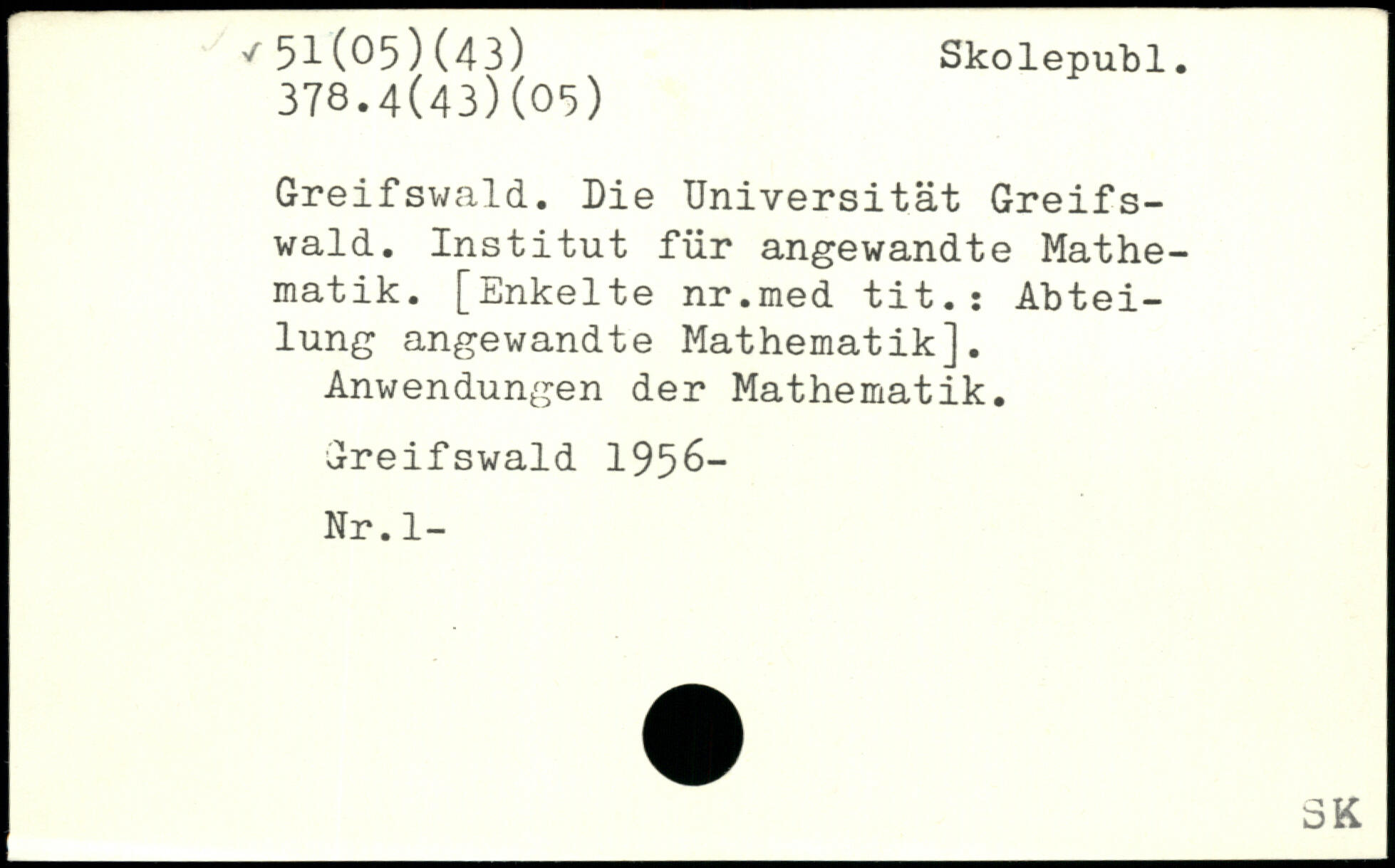 Greifswald. Die Universität Greifswald. Institut für angewandte Mathematik. [Enkelte nr.med tit.: Abteilung angewandte Mathematik], Anwendungen der Mathematik. Greifswald 1956- Nr.l-