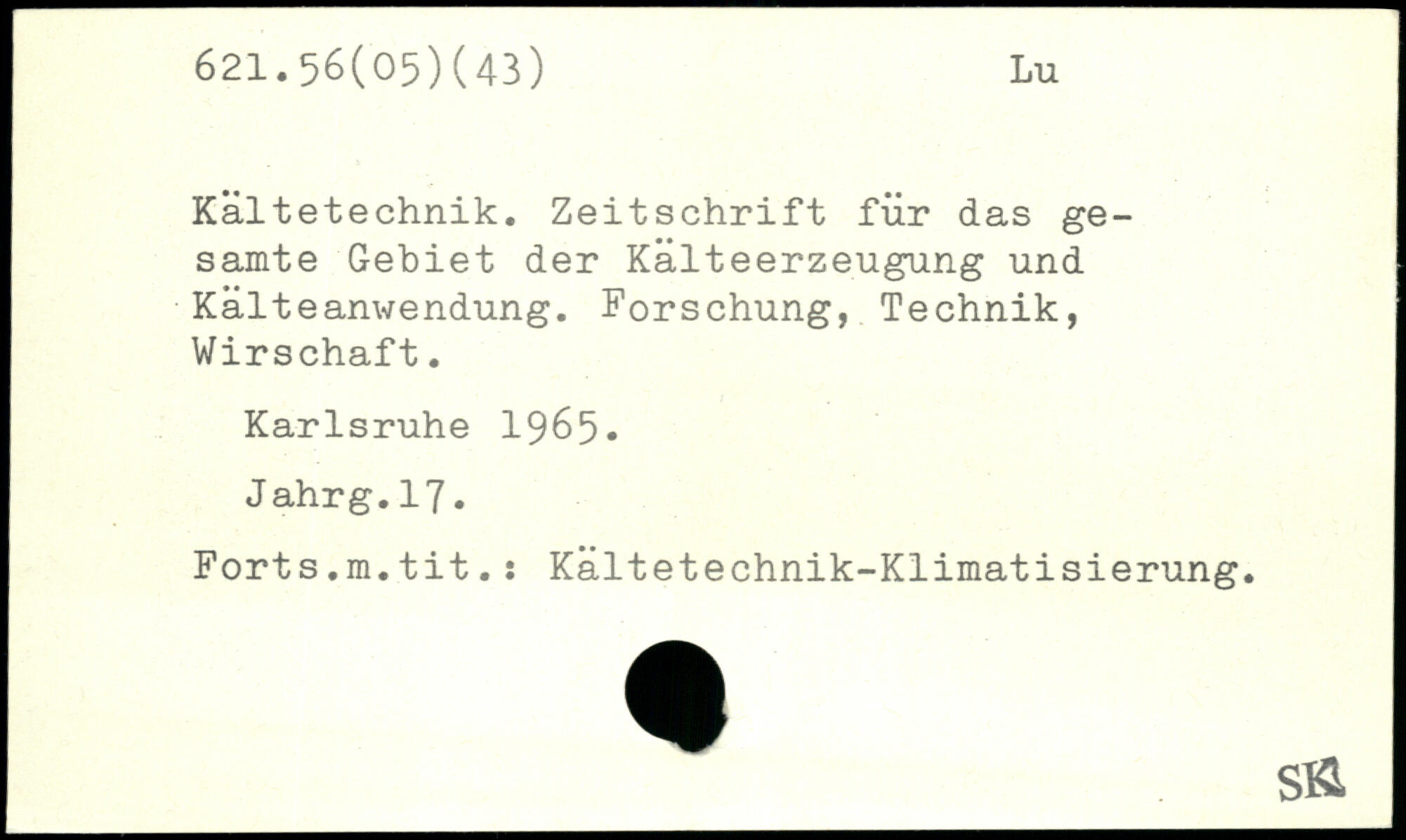 Kältetechnik. Zeitschrift für das gesamte Gebiet der Kälteerzeugung und Kälteanwendung. Forschung, Technik, Wirschaft. Karlsruhe 1965. Jahrg.17. Forts.m.tit.: Kältetechnik-Klimatisierung.