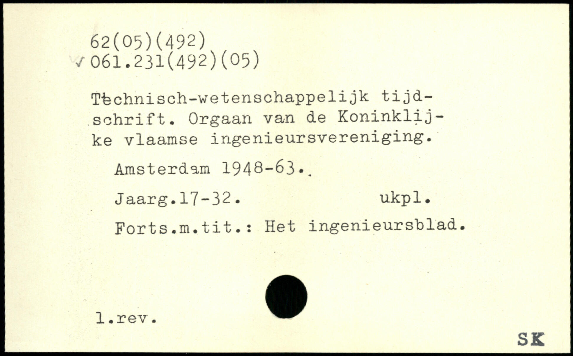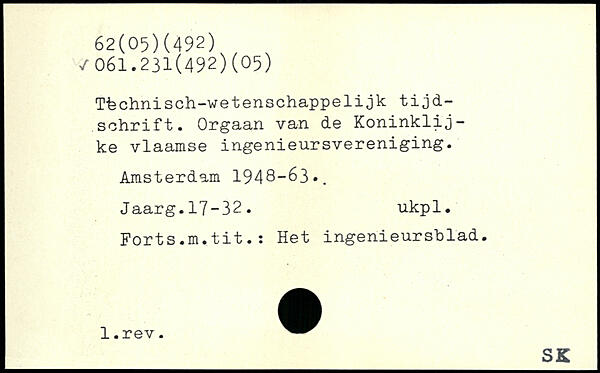 Tfechnisch-wetenschappelijk tijd- schrift. Orgaan van de Koninklij-ke vlaamse ingenieursvereniging. Amsterdam 1948-63,. Jaarg.17-32. ukpl. Forts.m.tit.; Het ingenieursblad.