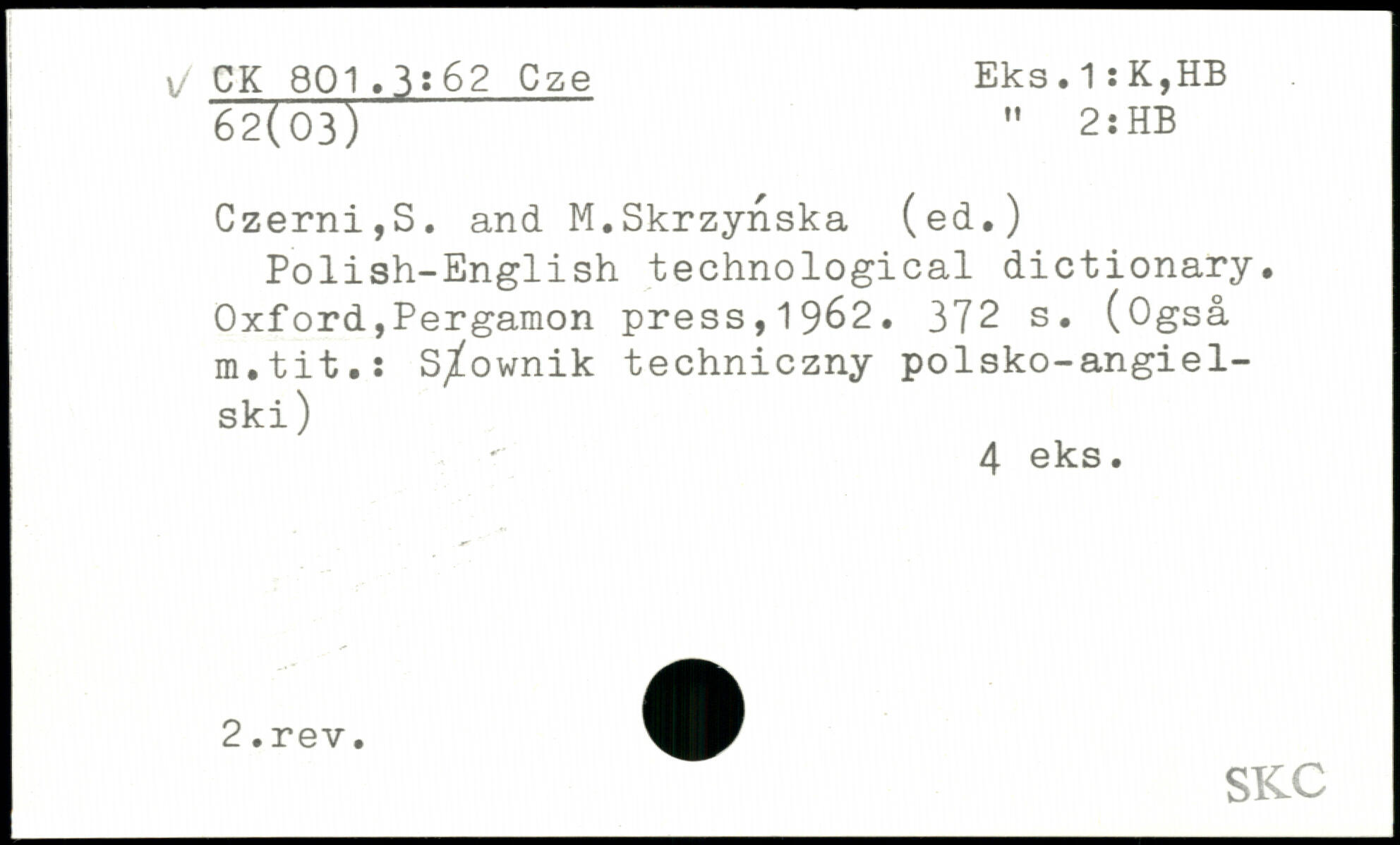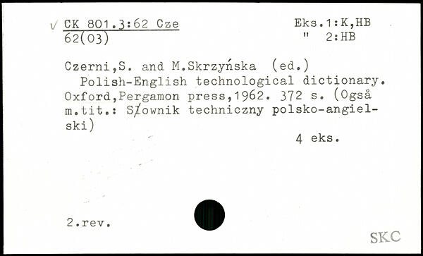 Polish-English technological dictionary, Oxford,Pergamon press,1962. 372 s. (Ogsä m.tit.: S/ownik techniczny polsko-angiel-ski )