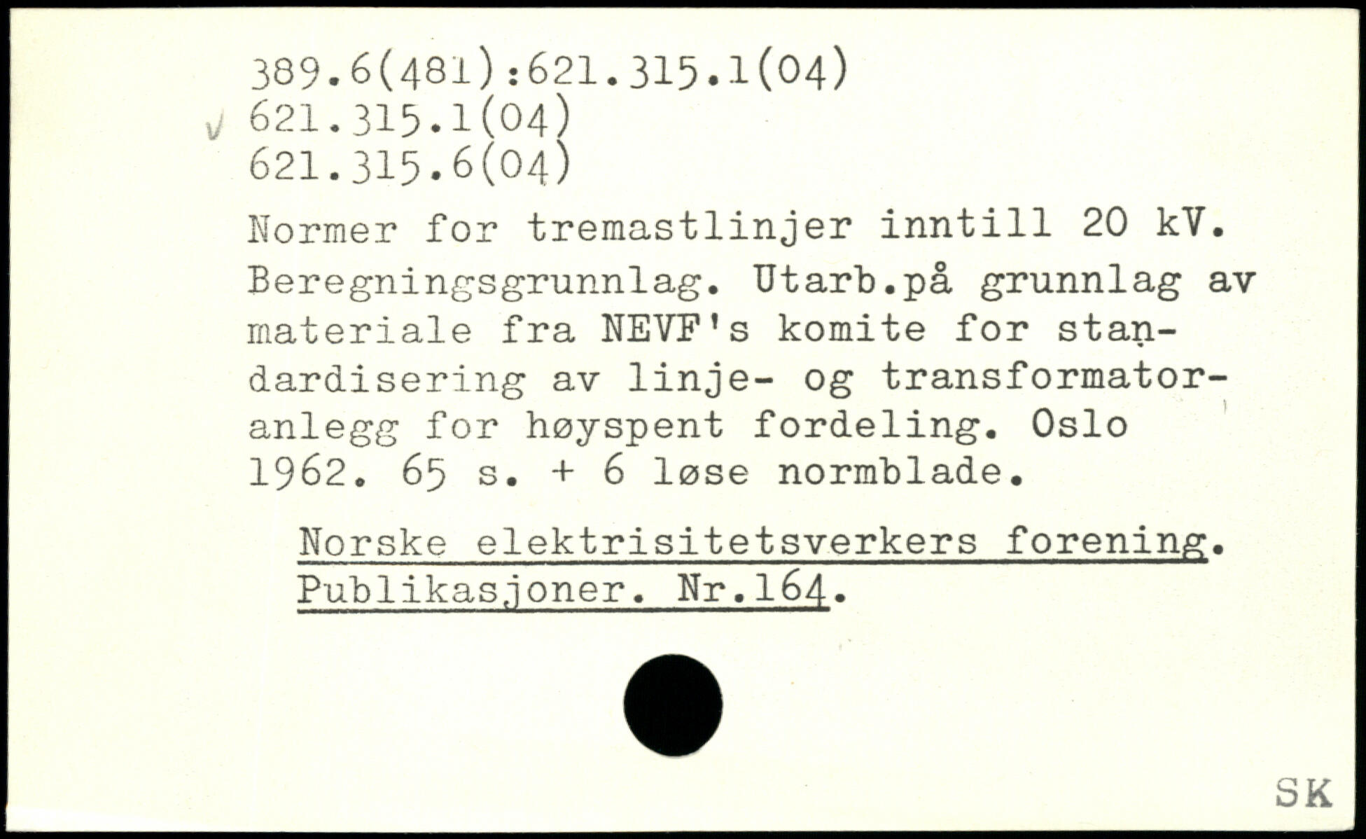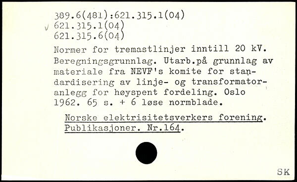Normer for tremastlinjer inntill 20 kV. Beregningsgrunnlag. Utarb.på grunnlag av materiale fra NEVF's komite for standardisering av linje- og transformator-anlegg for høyspent fordeling. Oslo 1962.