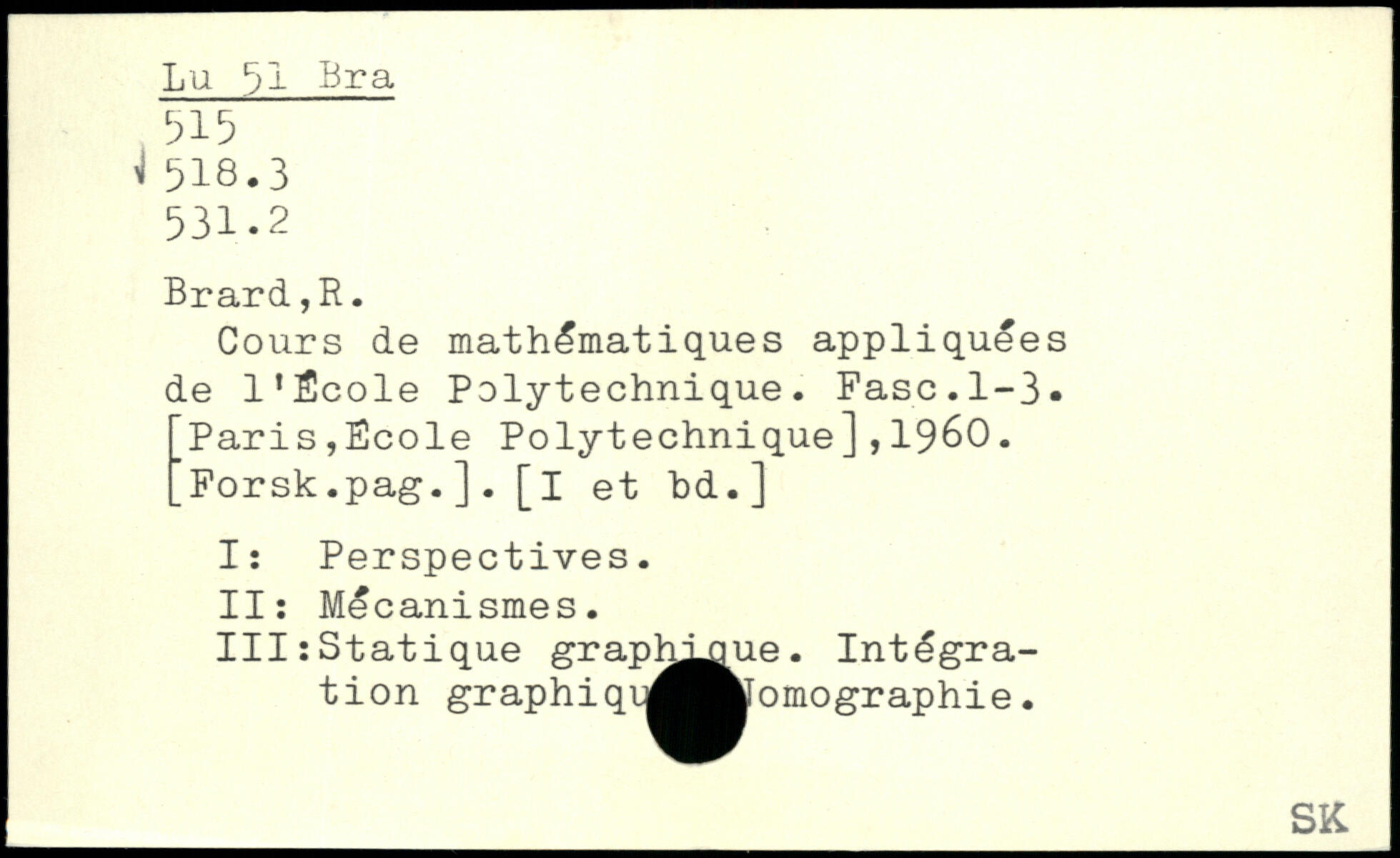 Cours de mathématiques appliquées de l’École Polytechnique. Fasc.1-3. Paris,École Polytechnique],1960. [Forsk.pag.]. [i et bd.] I: Perspectives. II: Mécanismes. III:Statique grapjr^iue. Intégration graphiqij^^Momographie.